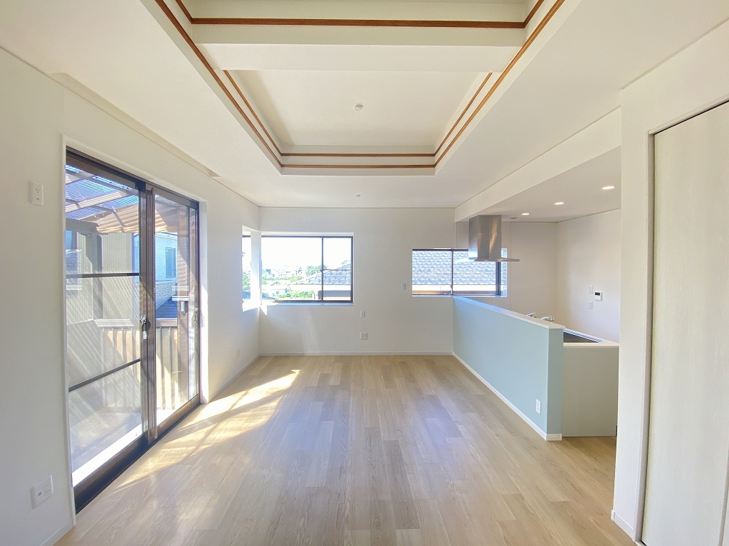 完成済につきいつでもご見学いただけます!(エステート白馬・江川恵子)吹き抜けのある23帖LDK。アイランドキッチンにカウンタースペース有。デザイナーズ住宅をお探しの方むけ。大型のファミリークロークも◯