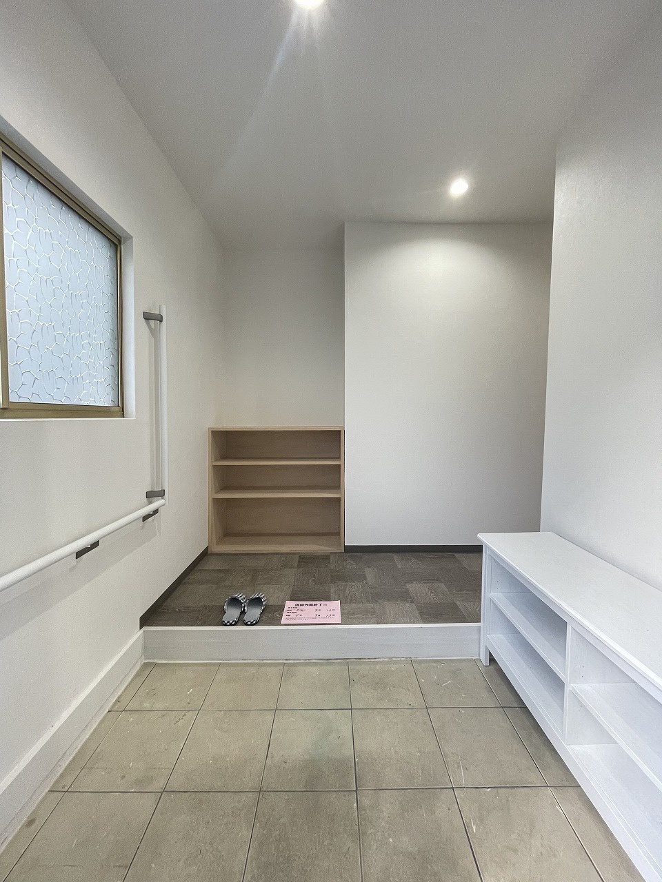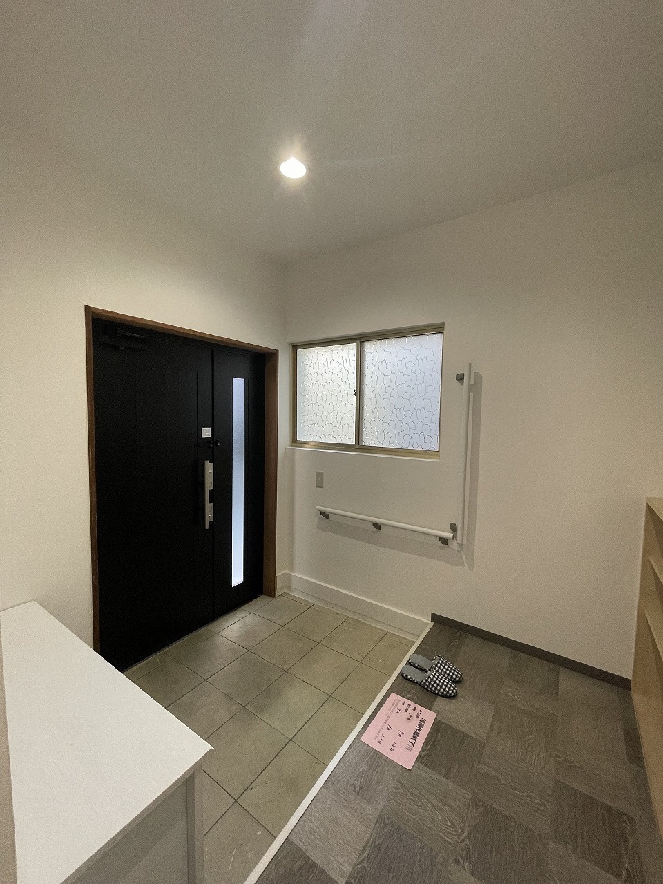 収納と窓のある機能的な玄関。上り框は低めになっています。