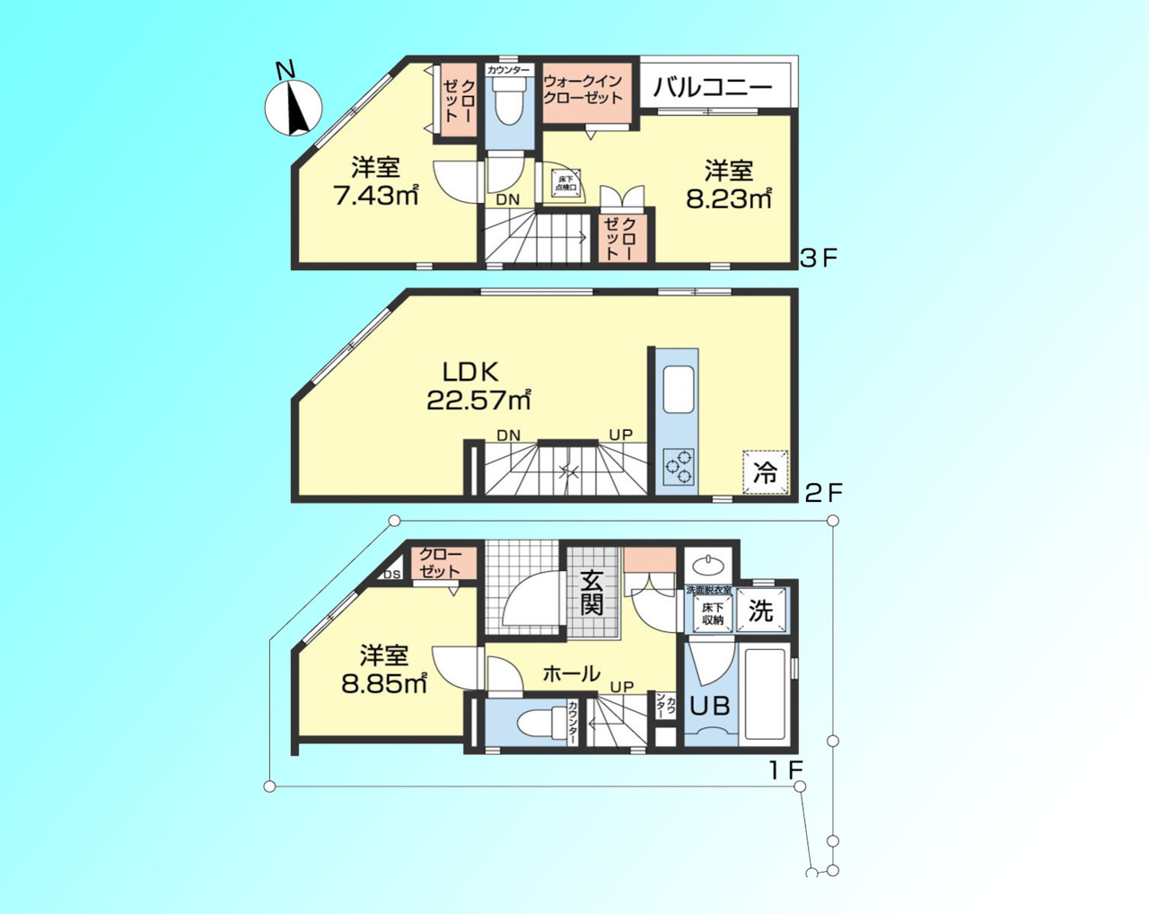 | 間取 | 3LDK (洋室8.85帖、LDK22.57帖、洋室7.43帖、洋室8.23帖) | ||