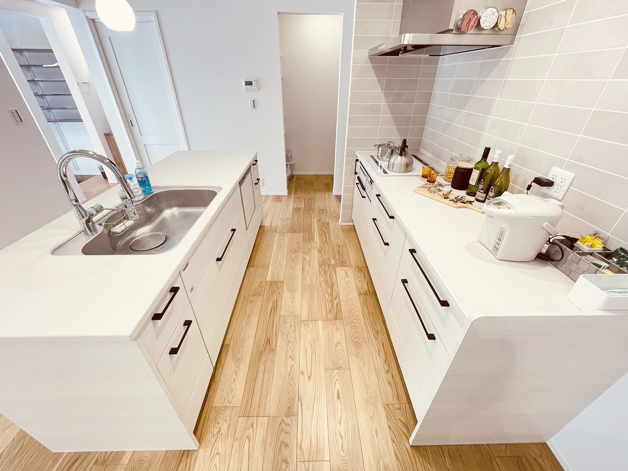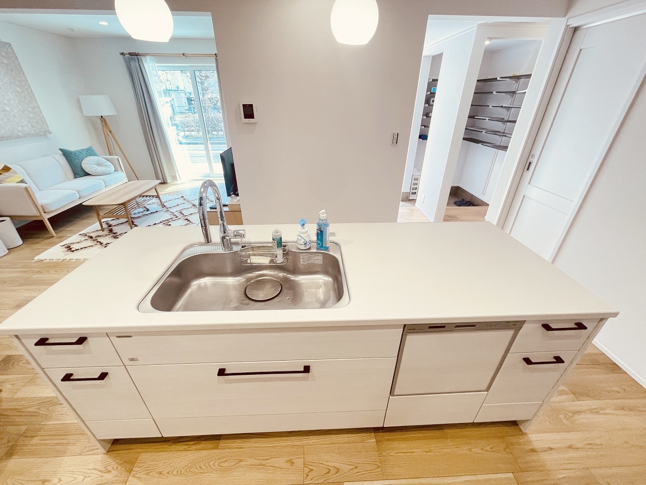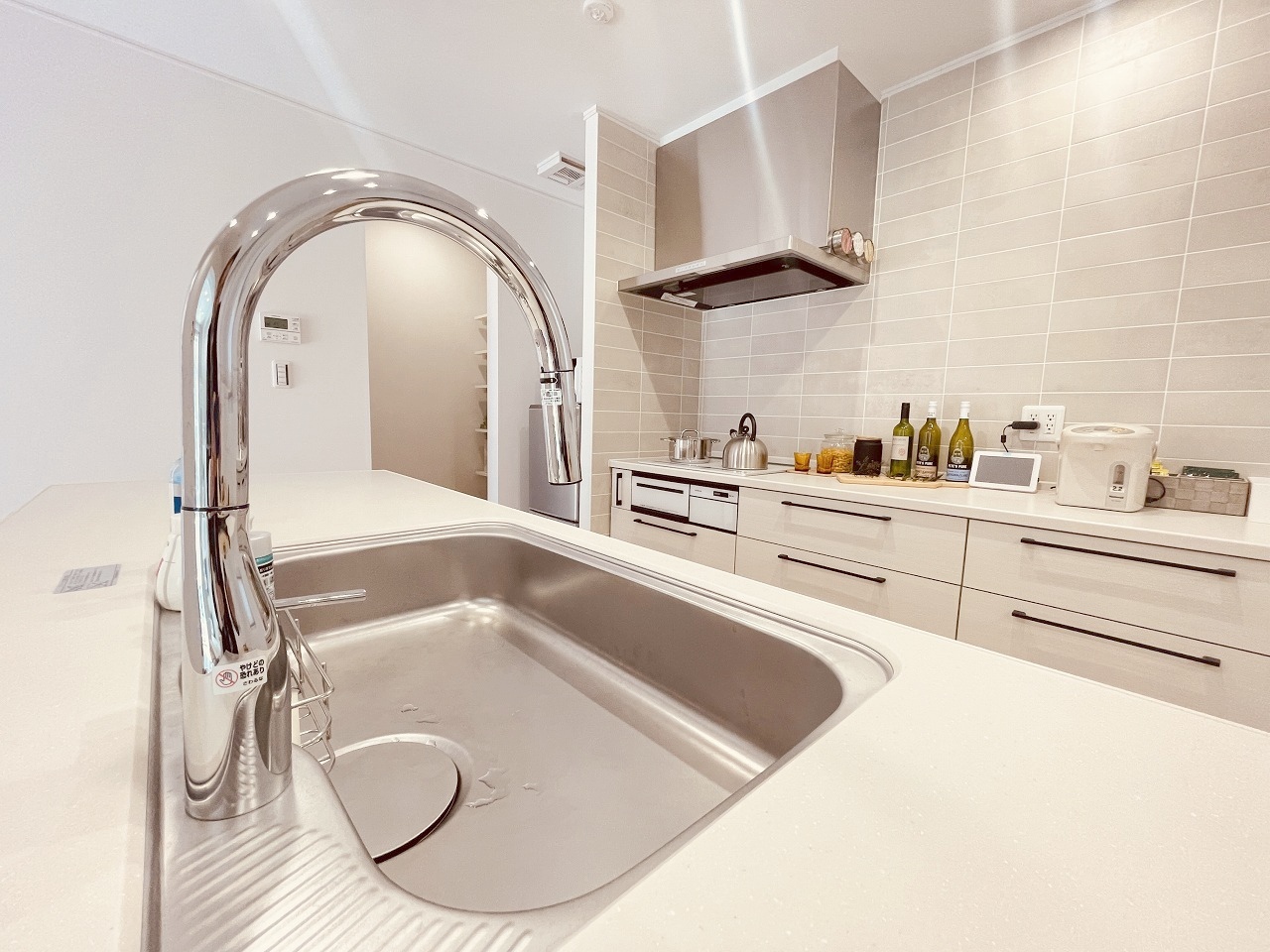 お料理をしながらリビングの家族やゲストとの会話が楽しめるカウンタータイプのキッチン。毎日のお料理を楽しく快適に。
