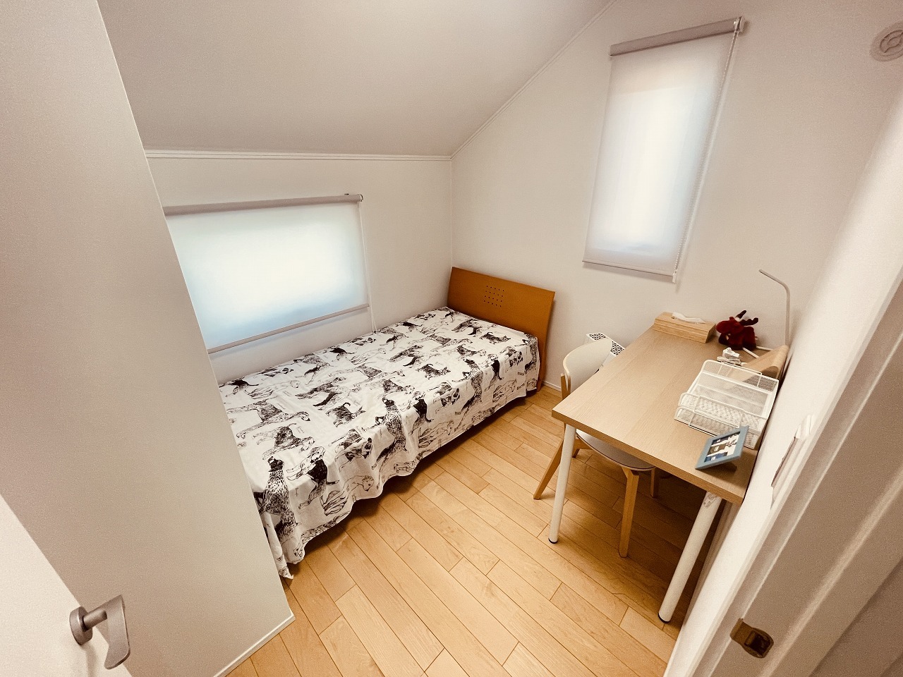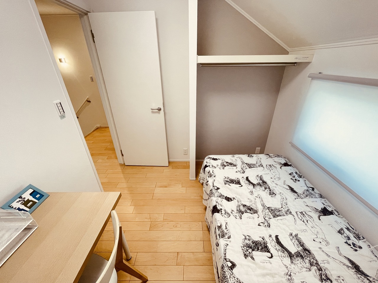 勾配天井の2階のお部屋。この勾配の角度がお洒落な雰囲気を感じさせてくれます。