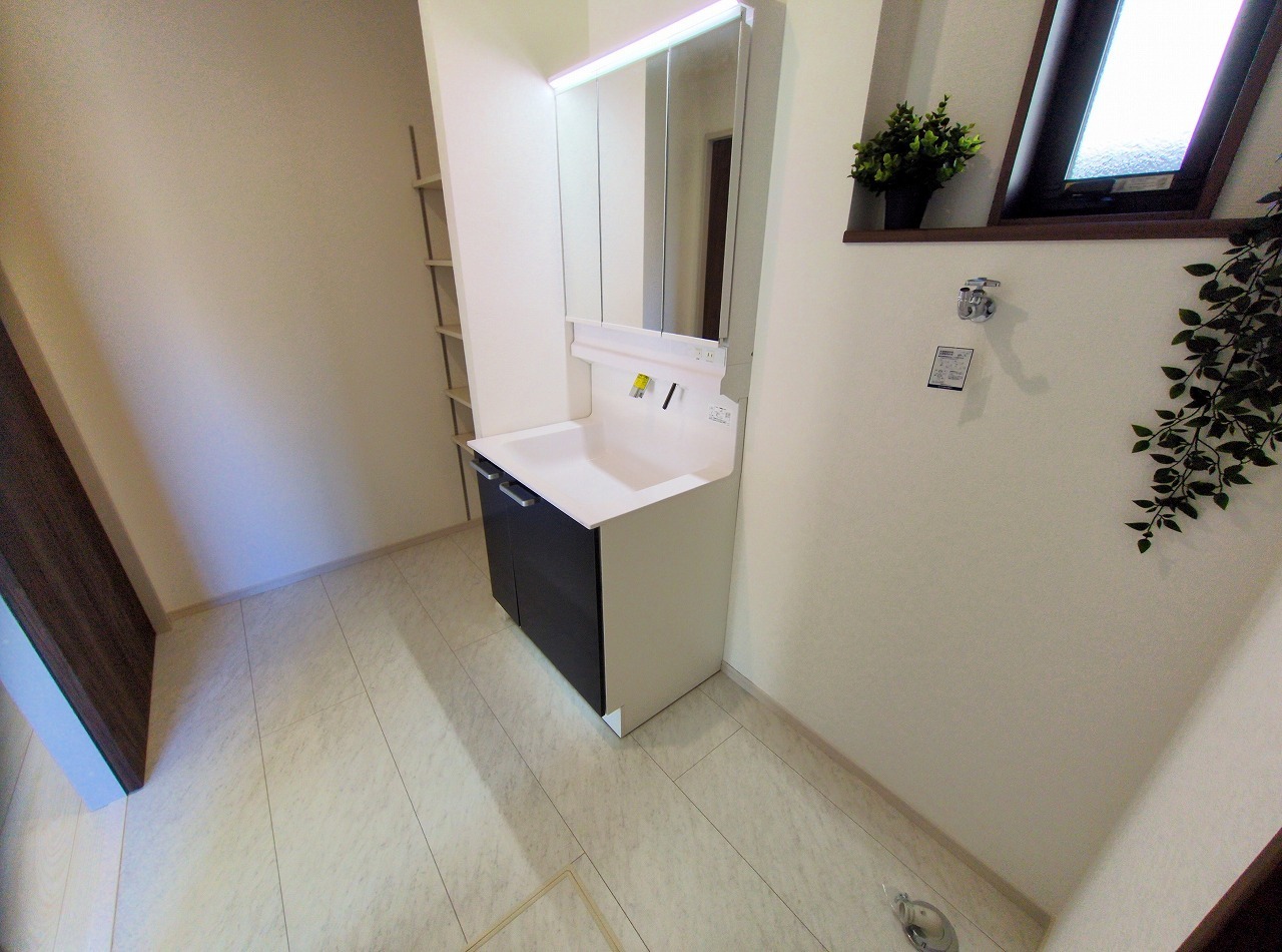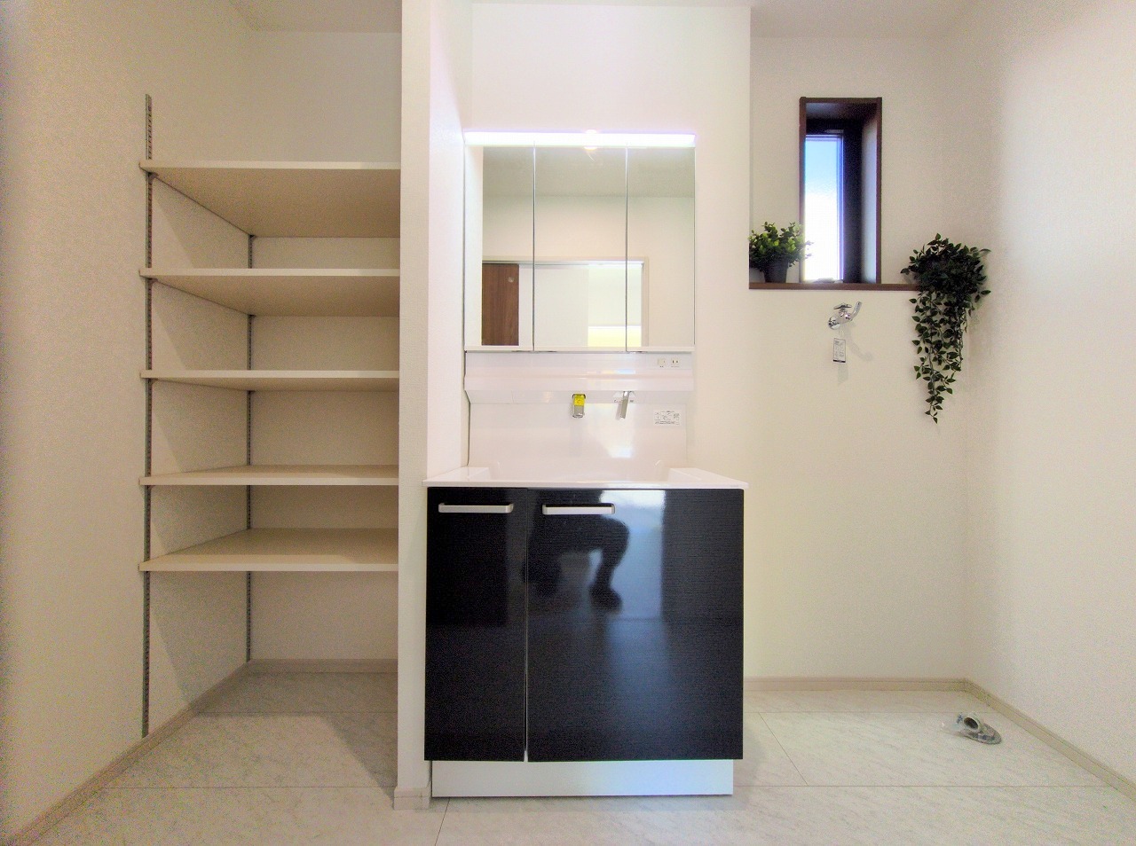 三面鏡を採用した洗面化粧台。鏡の裏にも収納スペースがあります。