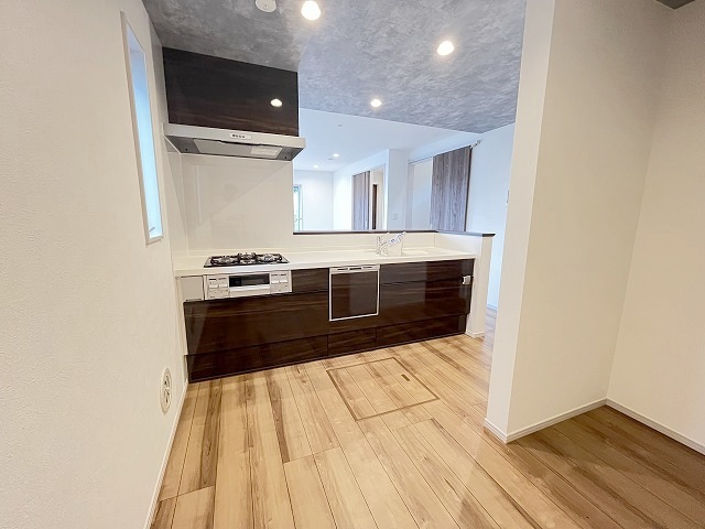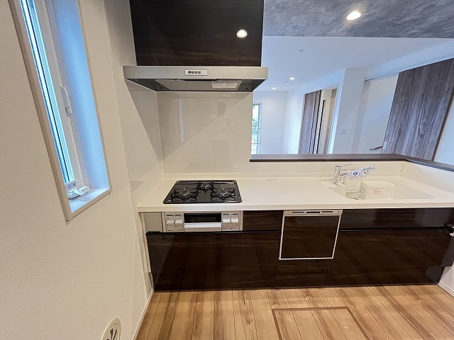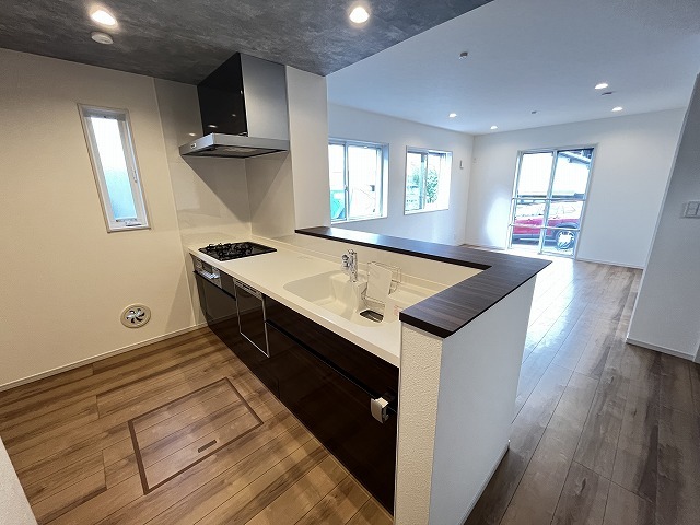 1号棟 カウンターキッチンならではの開放的な見通し、全体が見渡せることでご家族の団欒スペースもより明るく笑顔が溢れる空間となります。