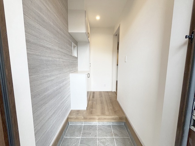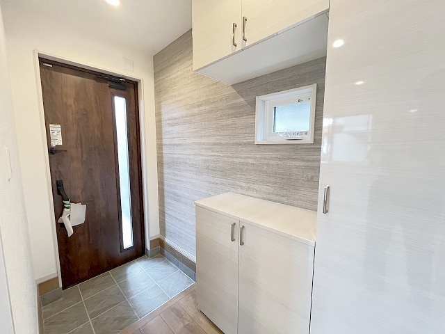 1号棟 コンパクトながらも、使い勝手の良い玄関スペース。明るいデザインと、収納スペースを効果的に配置することで、使い勝手を最大限に引き出しています。