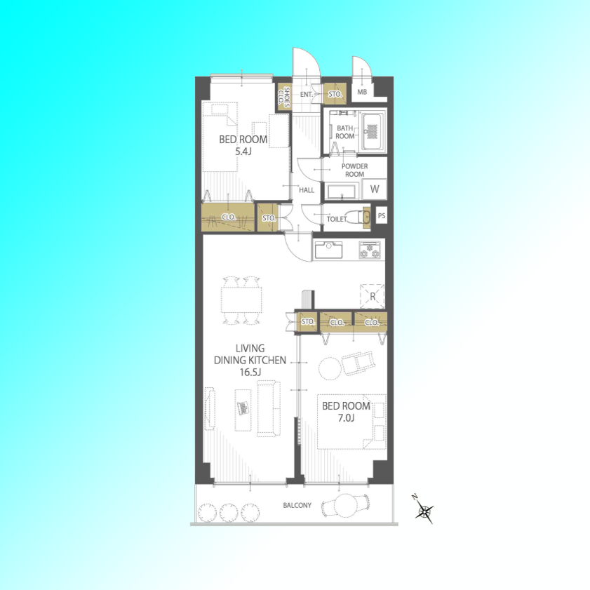 | 間取 | 2LDK (LDK16.5帖、洋室7帖、洋室5.4帖) | ||