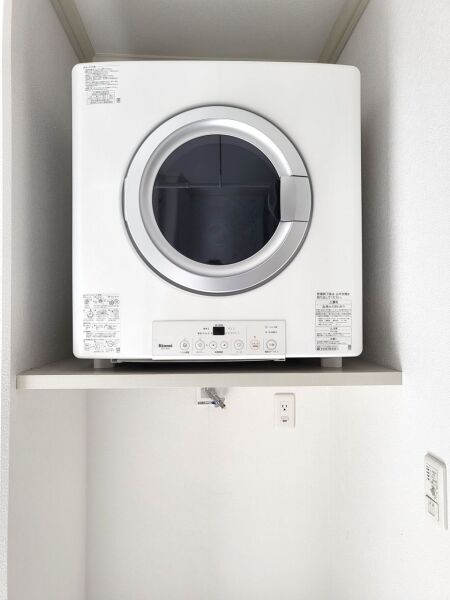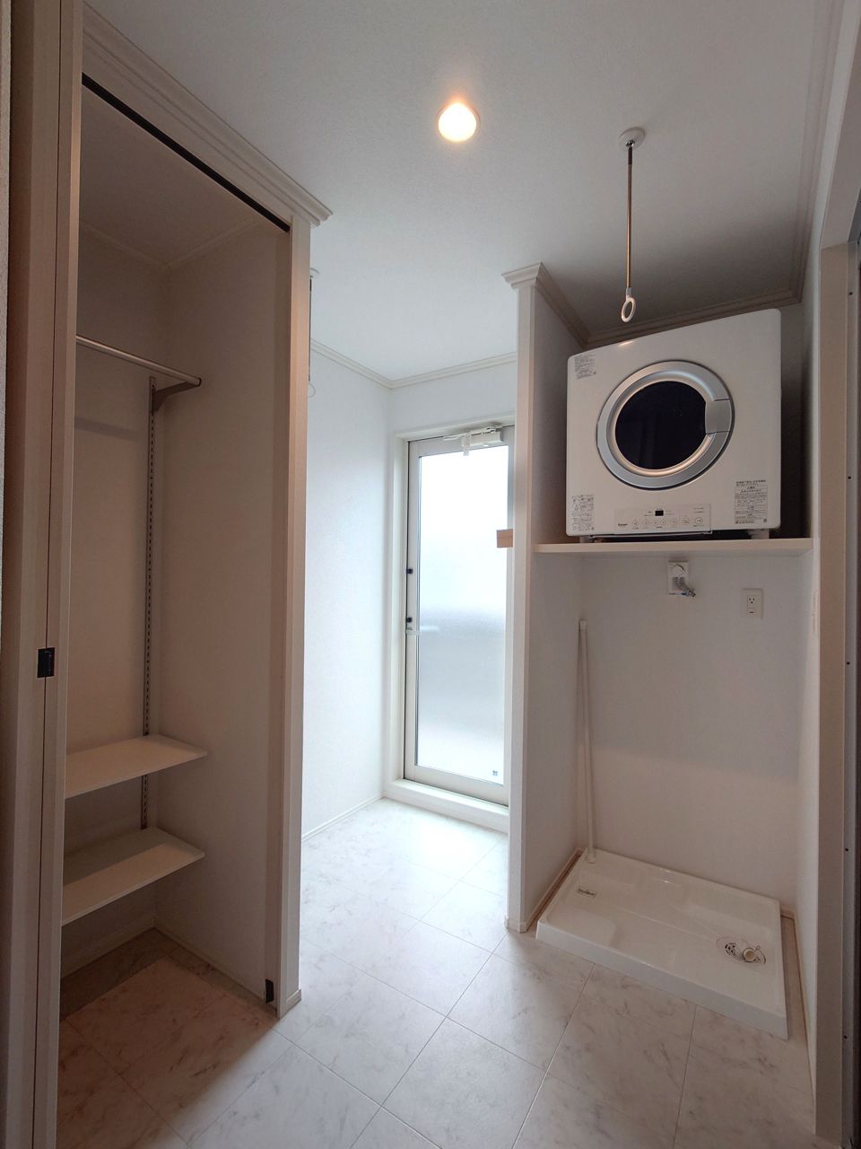 洗面室奥のランドリースペース バルコニーで外干し、室内で乾燥機、室内干し、広さにゆとりがありますので色々な選択肢がございます。