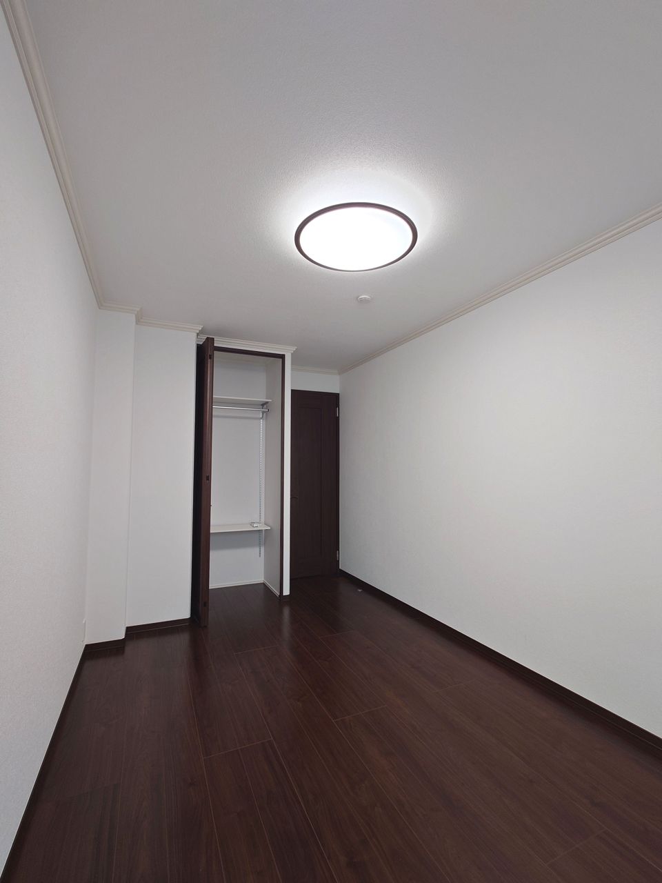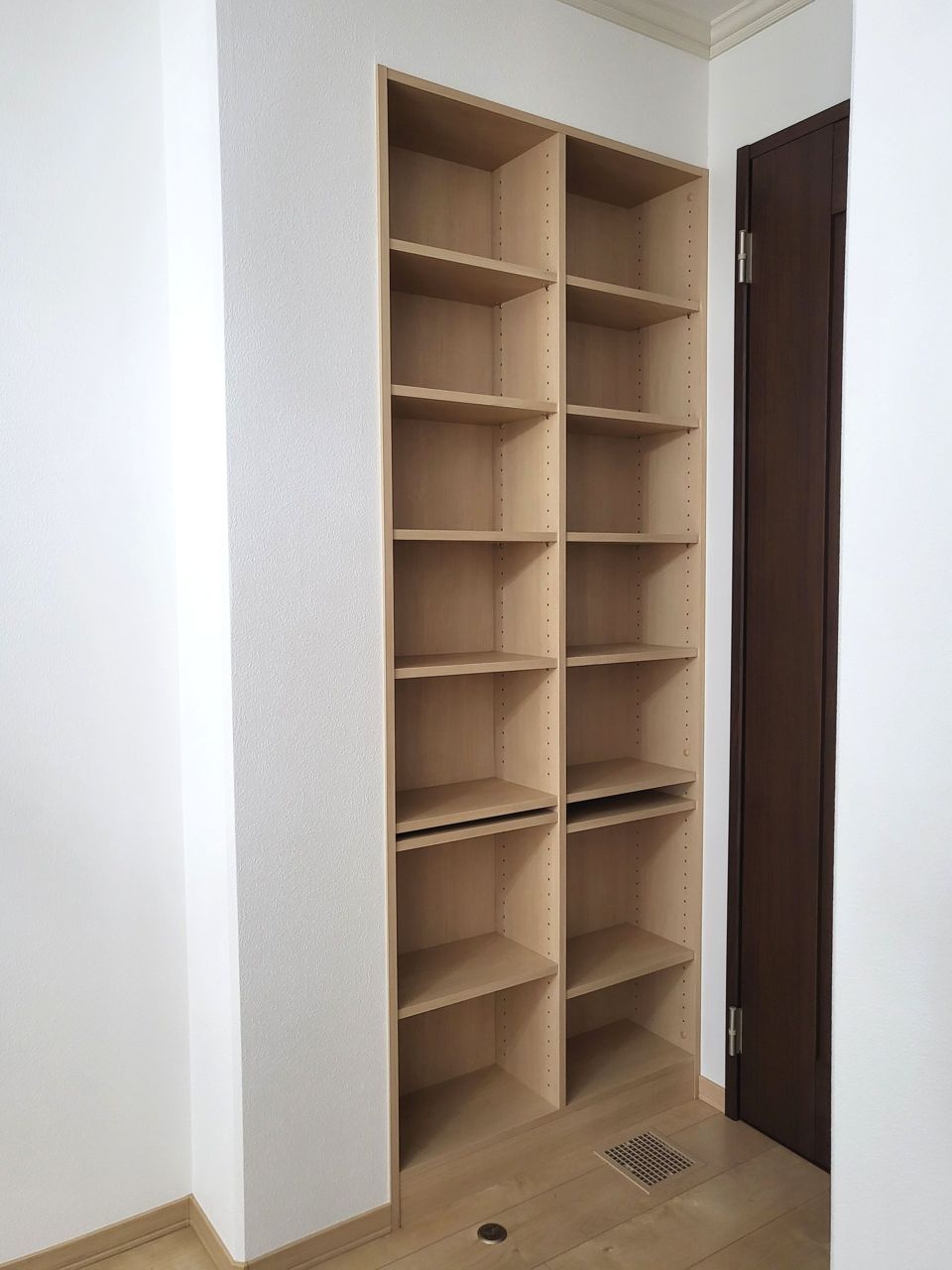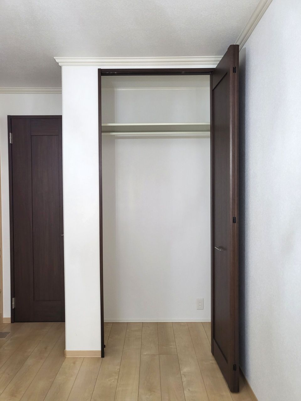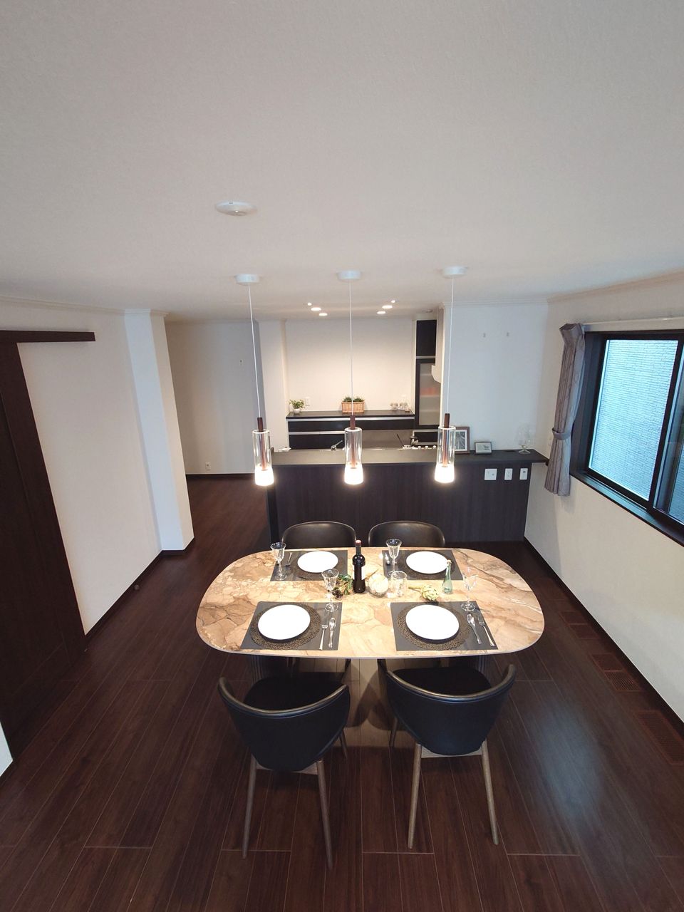 濃いめの木目調が、白い壁紙にマッチして木の暖かさを演出してます。