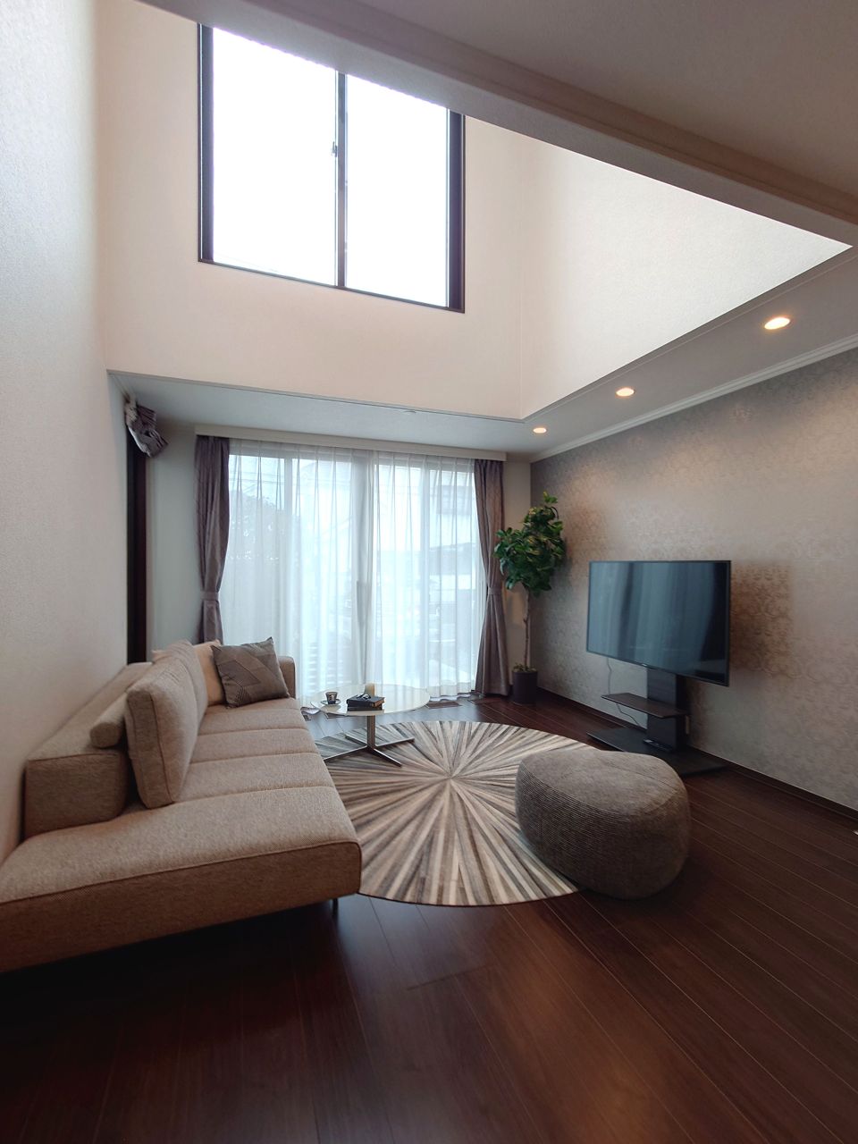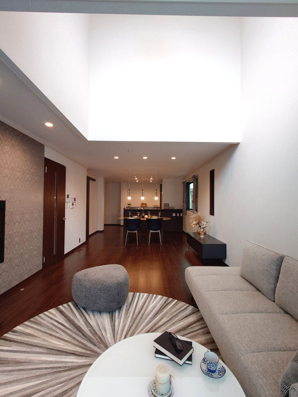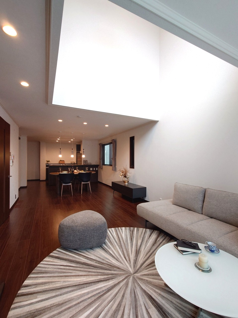 ~吹き抜け 光の降り注ぐ邸宅~ 南向きのLD、19.8帖の広さがありますが、吹き抜けを設けることで明るさを保っております。 LDKでは約26.4帖