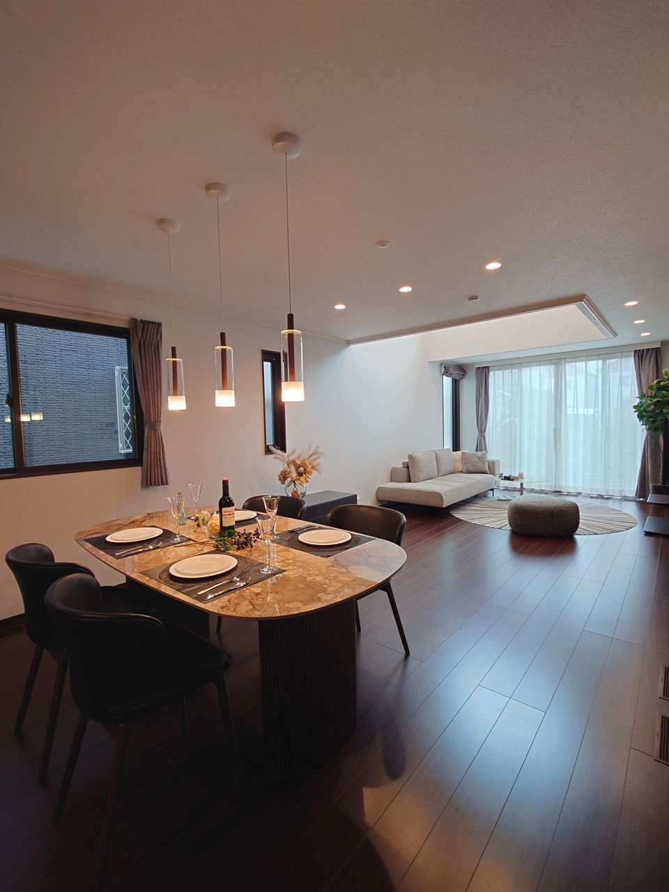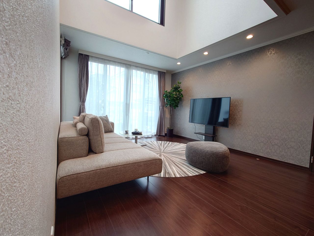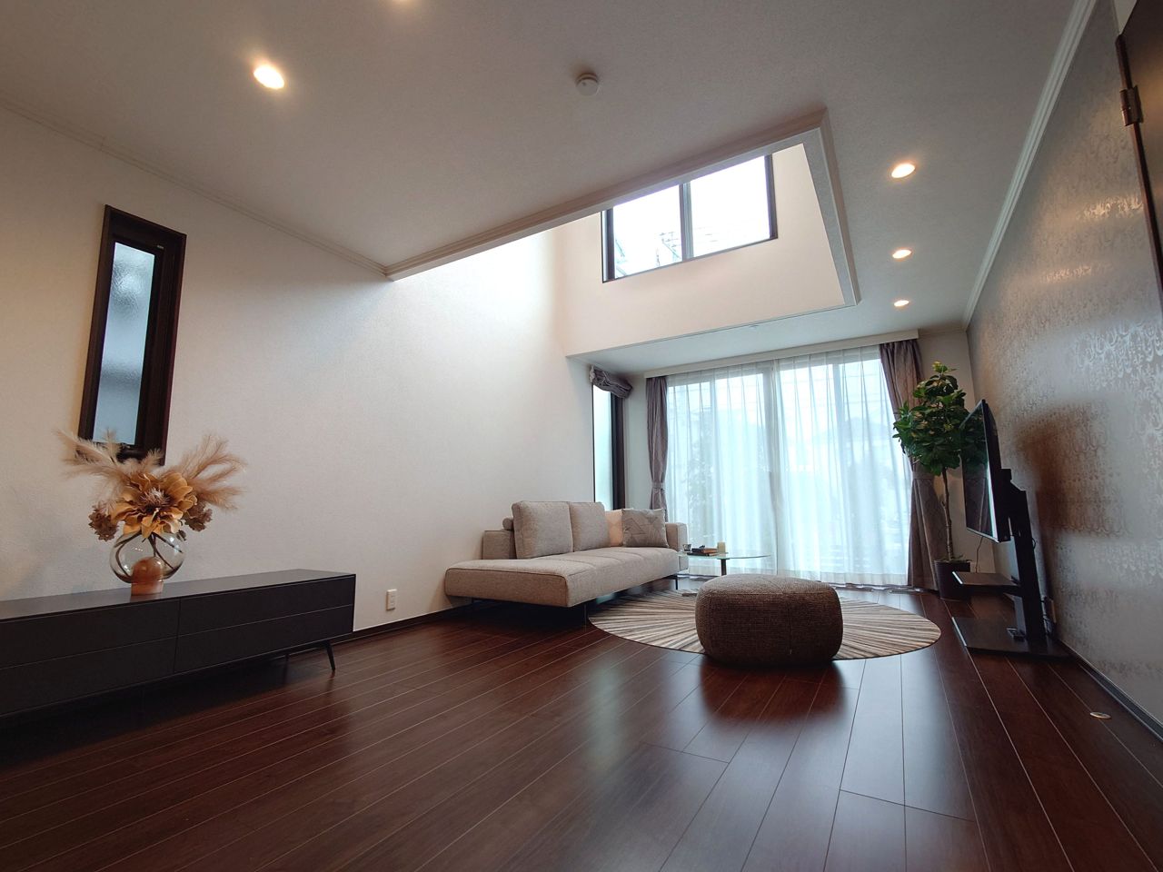 ~吹き抜け 光の降り注ぐ邸宅~ 南向きのLD、19.8帖の広さがありますが、吹き抜けを設けることで明るさを保っております。 LDKでは約26.4帖