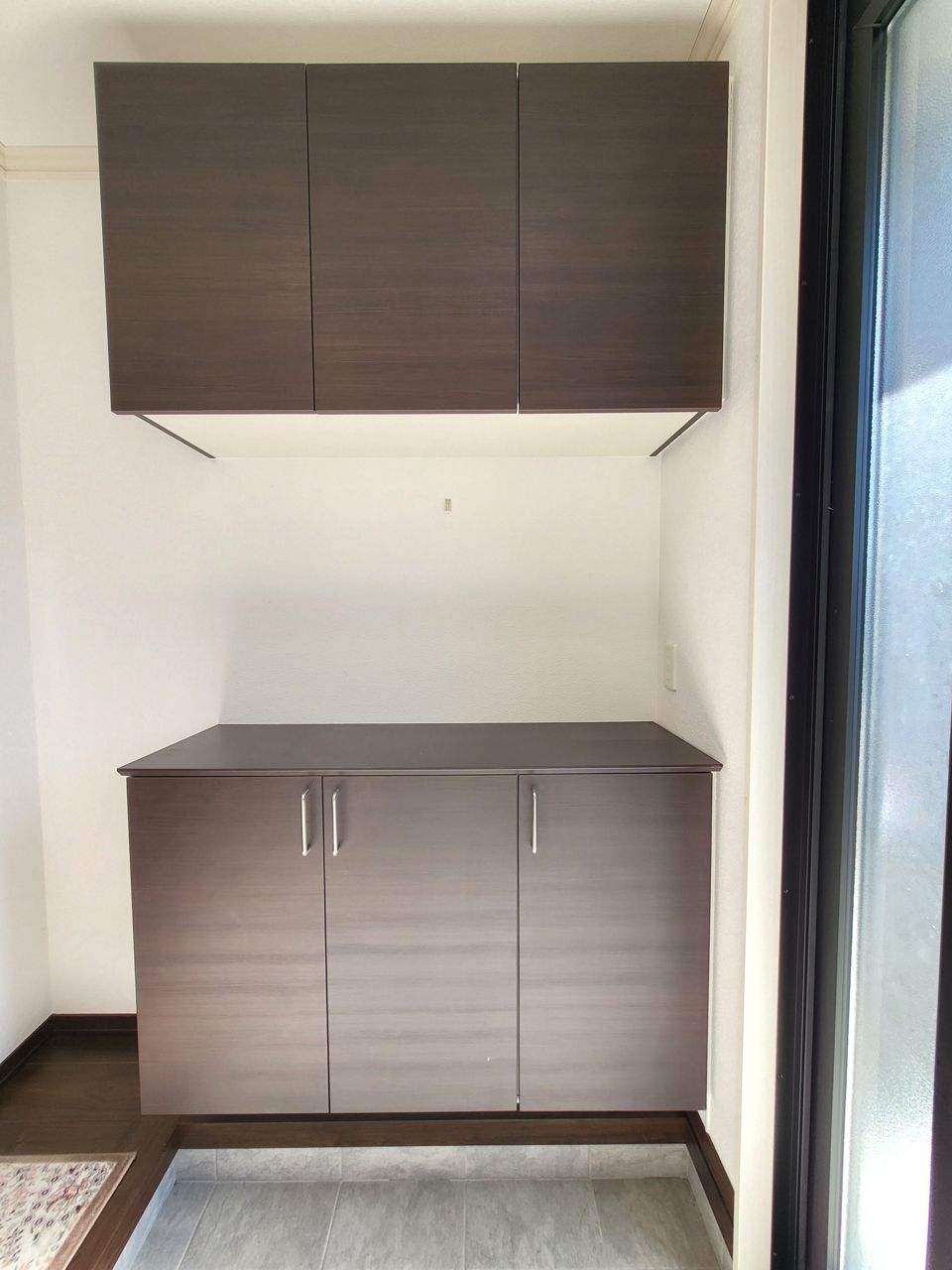 吊戸棚をキッチンの背面に設置、視界を遮らずに収納力を確保しました。