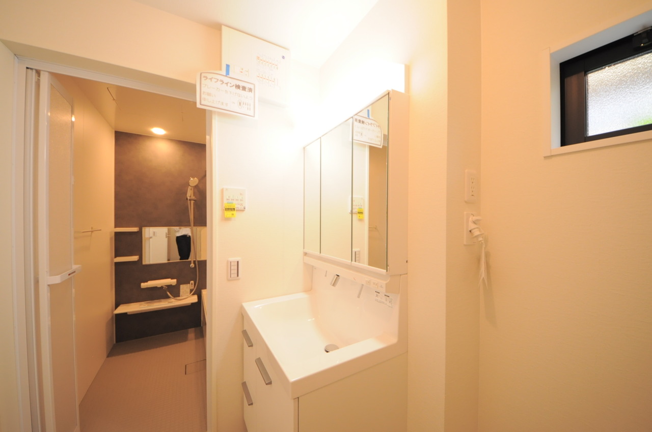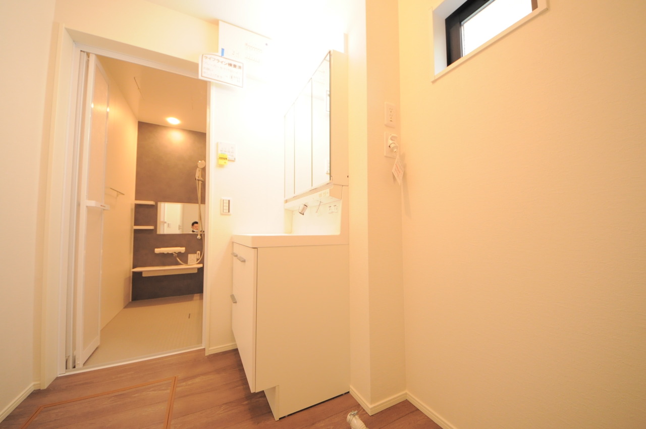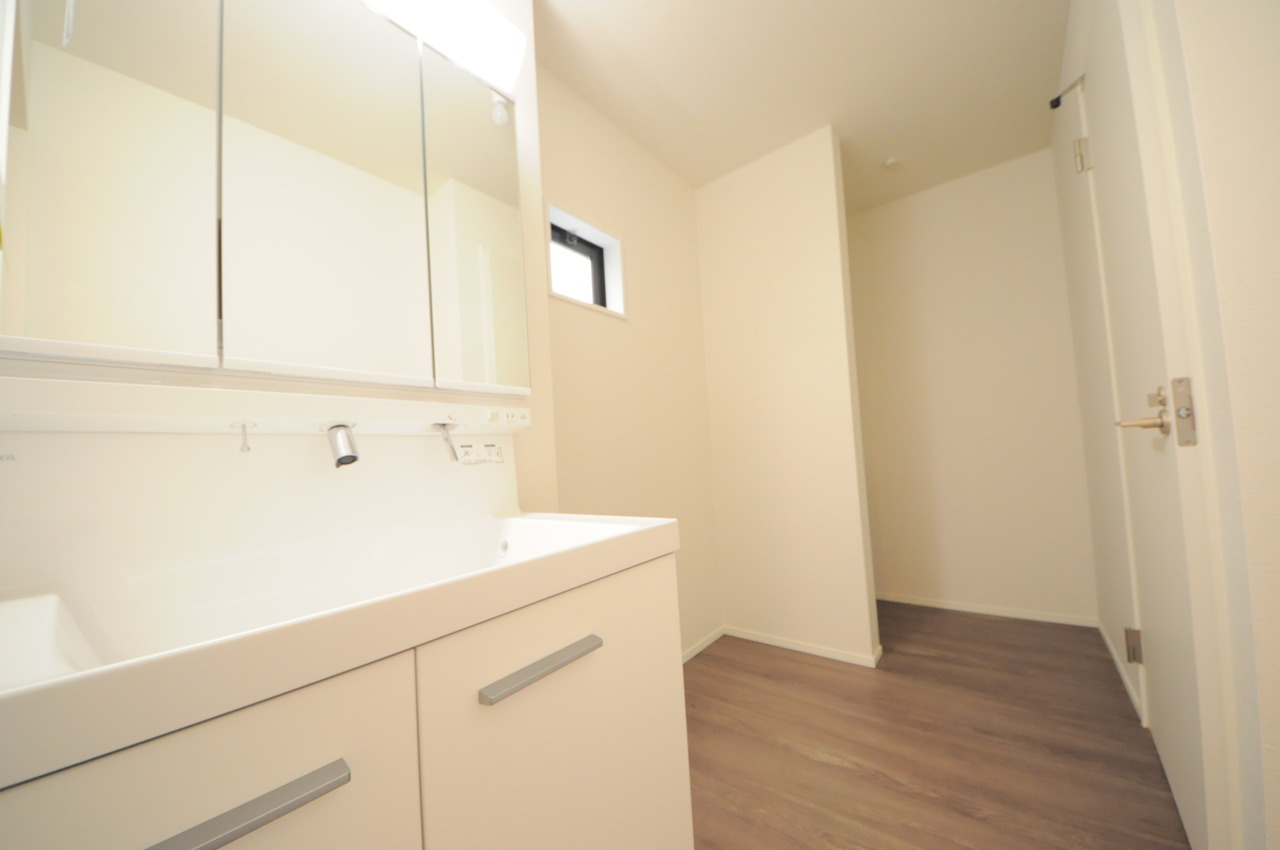 2号棟 使い勝手の良い洗面台、窓があることで換気もしやすく清潔感のある空間を保てます。