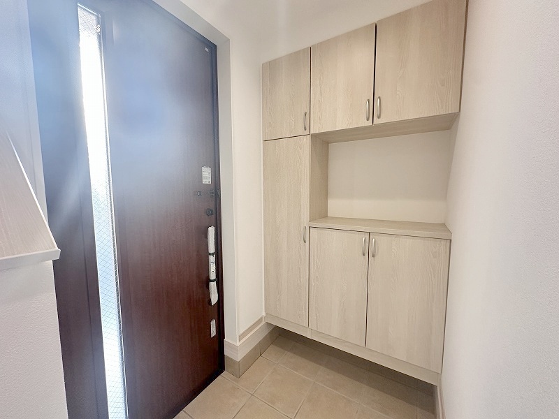 玄関は家の第一印象を左右する重要な場所。ほどよい広さとスタイリッシュな色遣いが印象的です。