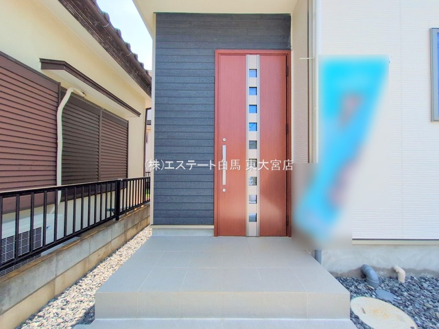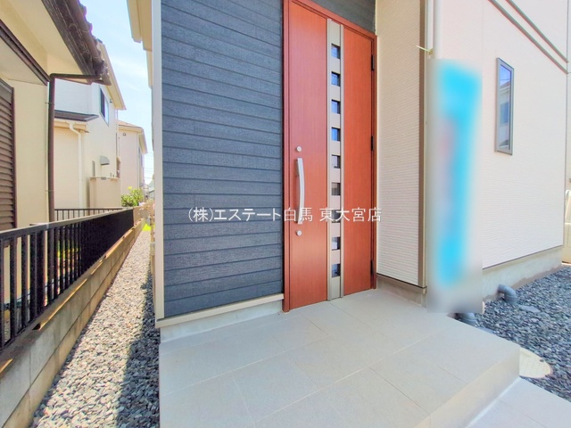 ポーチのついた新築分譲物件。玄関の印象はいかがでしょうか?入口からご覧ください。