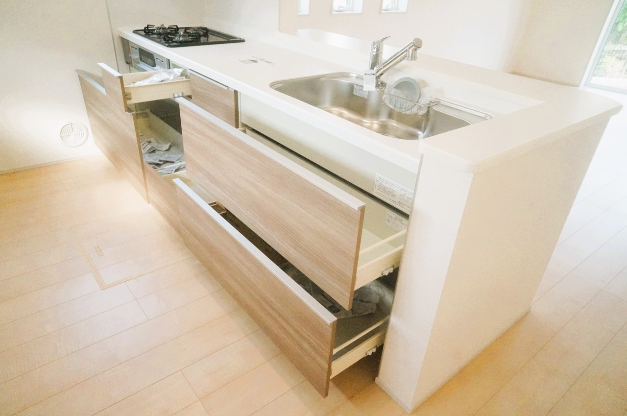 収納スライドをぐっと開けばお鍋や調味料をどんどんしまえる大収納。キッチンはいつもキレイ。