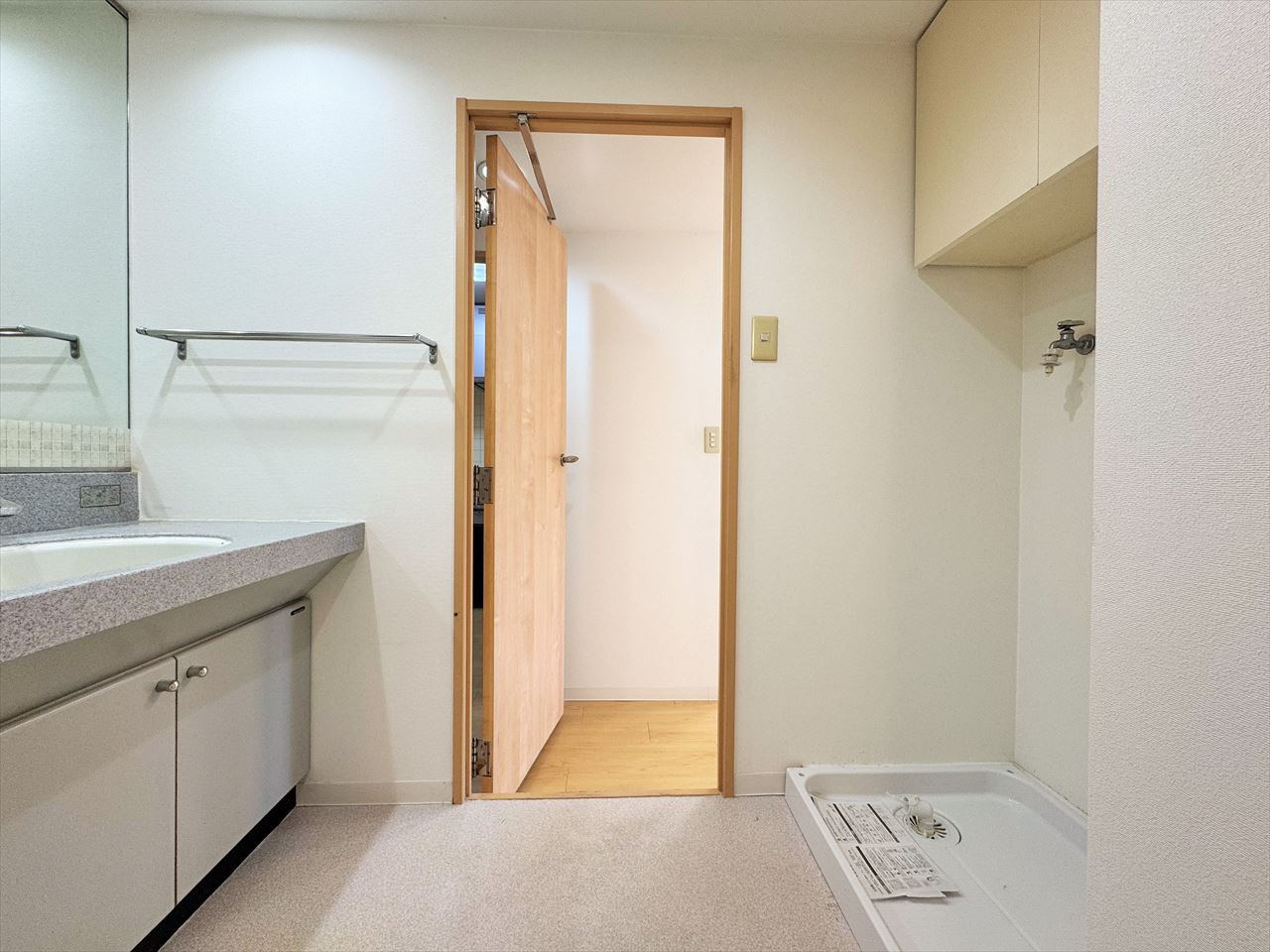 生活用品のレイアウトが見やすい一面鏡タイプの洗面化粧台。