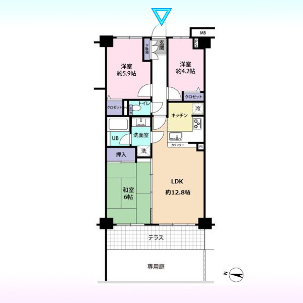 | 間取 | 3LDK (LDK12.8帖、和室6帖、洋室5.9帖、洋室4.2帖) | ||