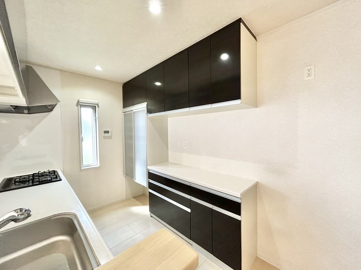 吊戸棚をキッチンの背面に設置、視界を遮らずに収納力を確保しました。