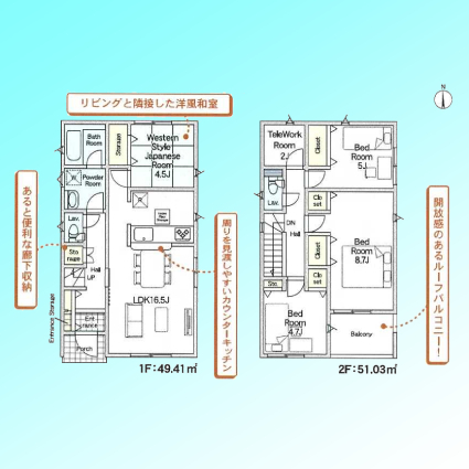 | 間取 | 4LDK + テレワークルーム2帖 (LDK16.5帖、和室4.5帖、洋室8.7帖、洋室5帖、洋室4.7帖) | ||