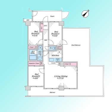 | 間取 | 3LDK (LD17.5帖、洋室4.8帖、洋室5.4帖、洋室5.6帖) | ||
