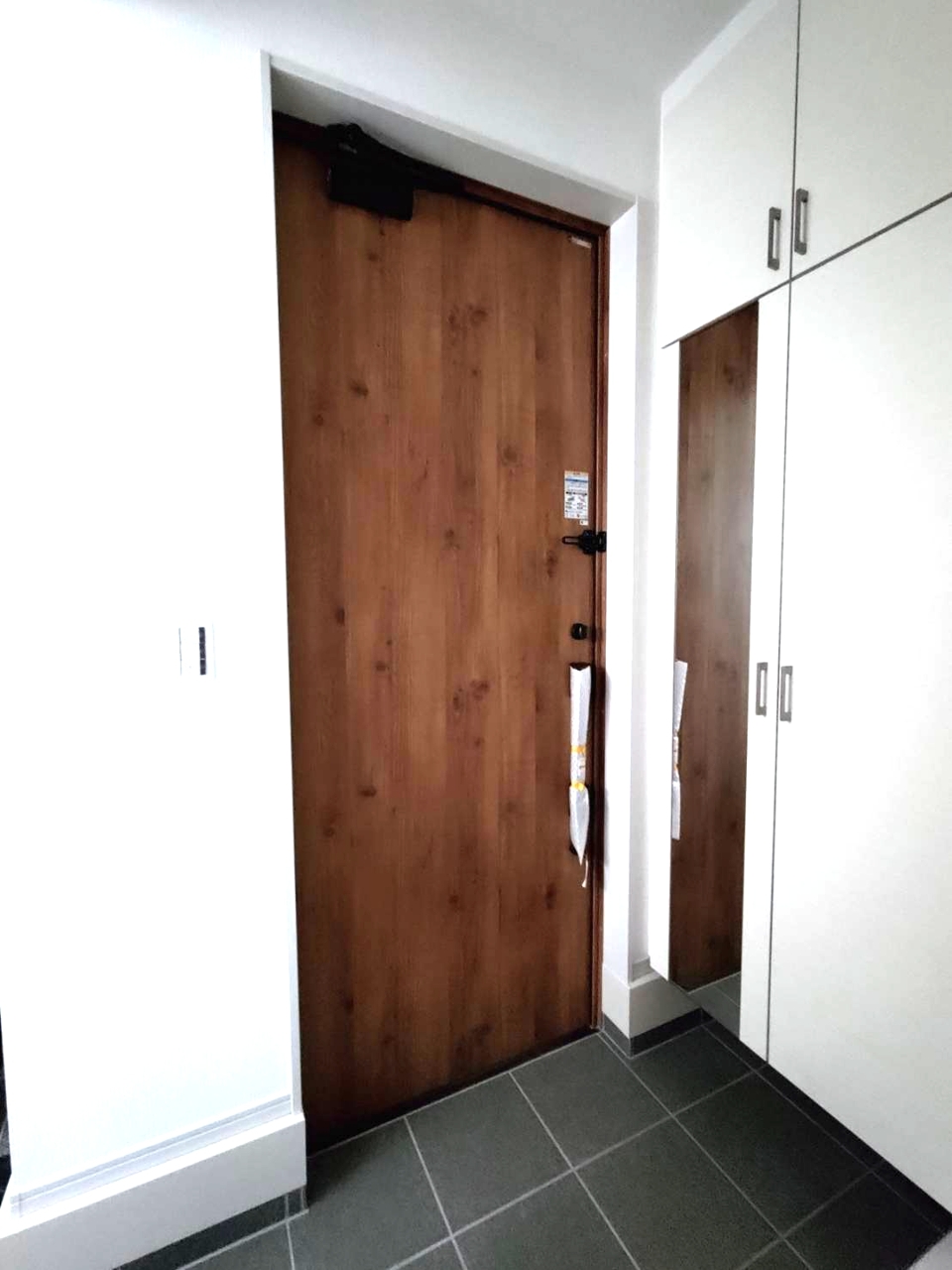 忙しい朝でもさっと身だしなみの確認が出来る大きな鏡付きシューズクローク