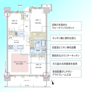 | 間取 | 3LDK (LDK13.9帖、洋室6帖、洋室4.5帖、洋室4.5帖) | ||