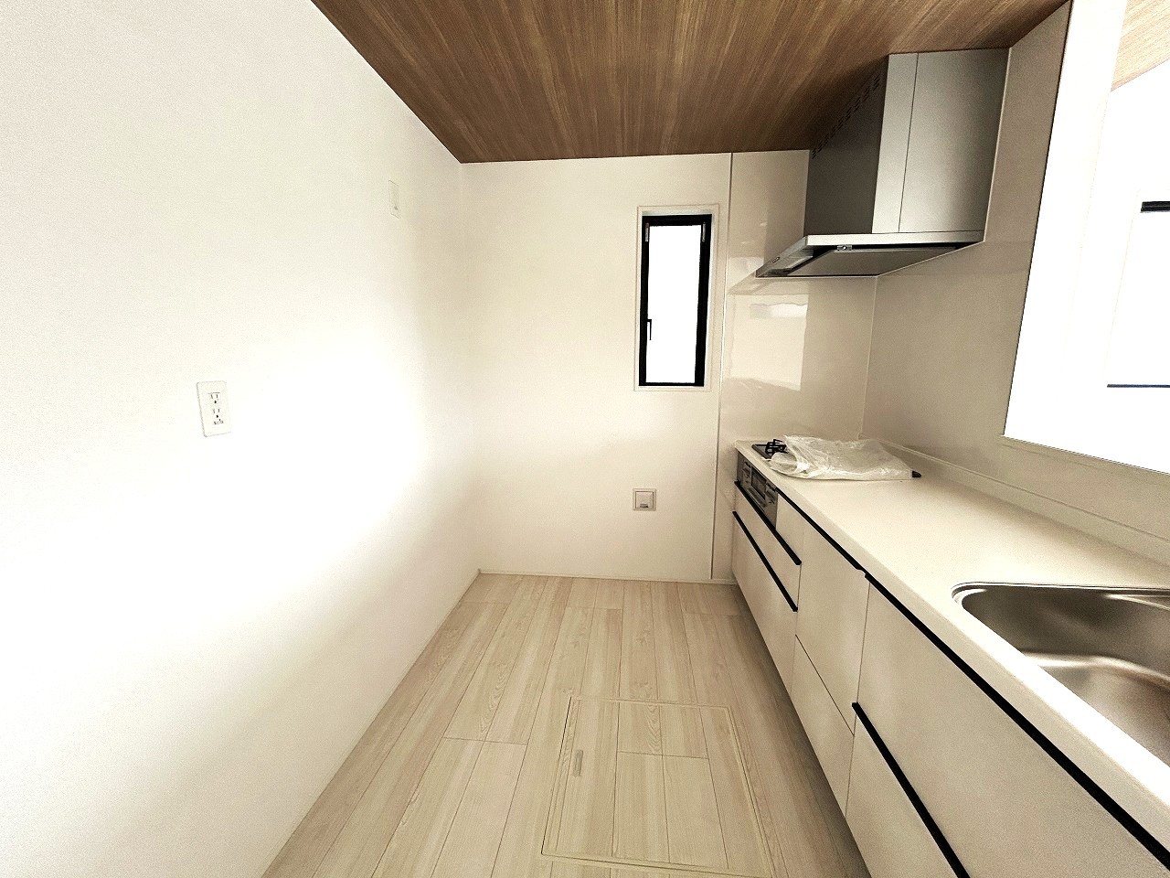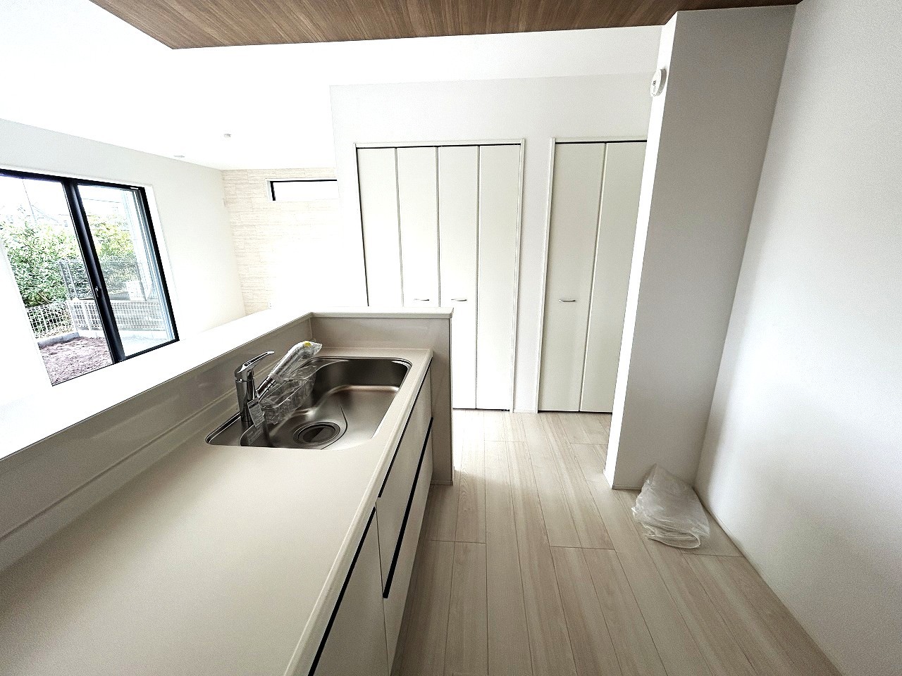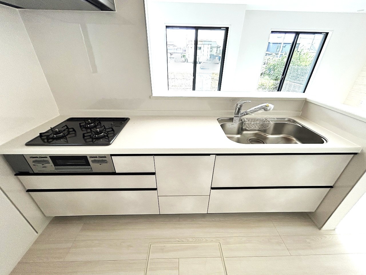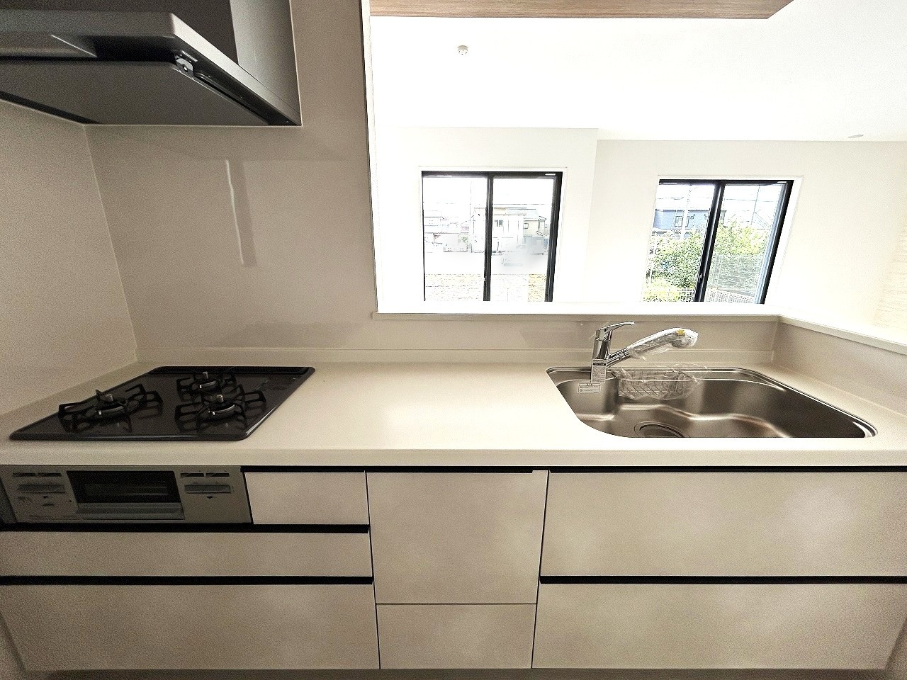 1号棟 リビングにいる家族の顔が見渡せるカウンターキッチン。お料理もより一層おいしく、楽しく。食器棚を背面に設置しても十分な広さを確保しています。