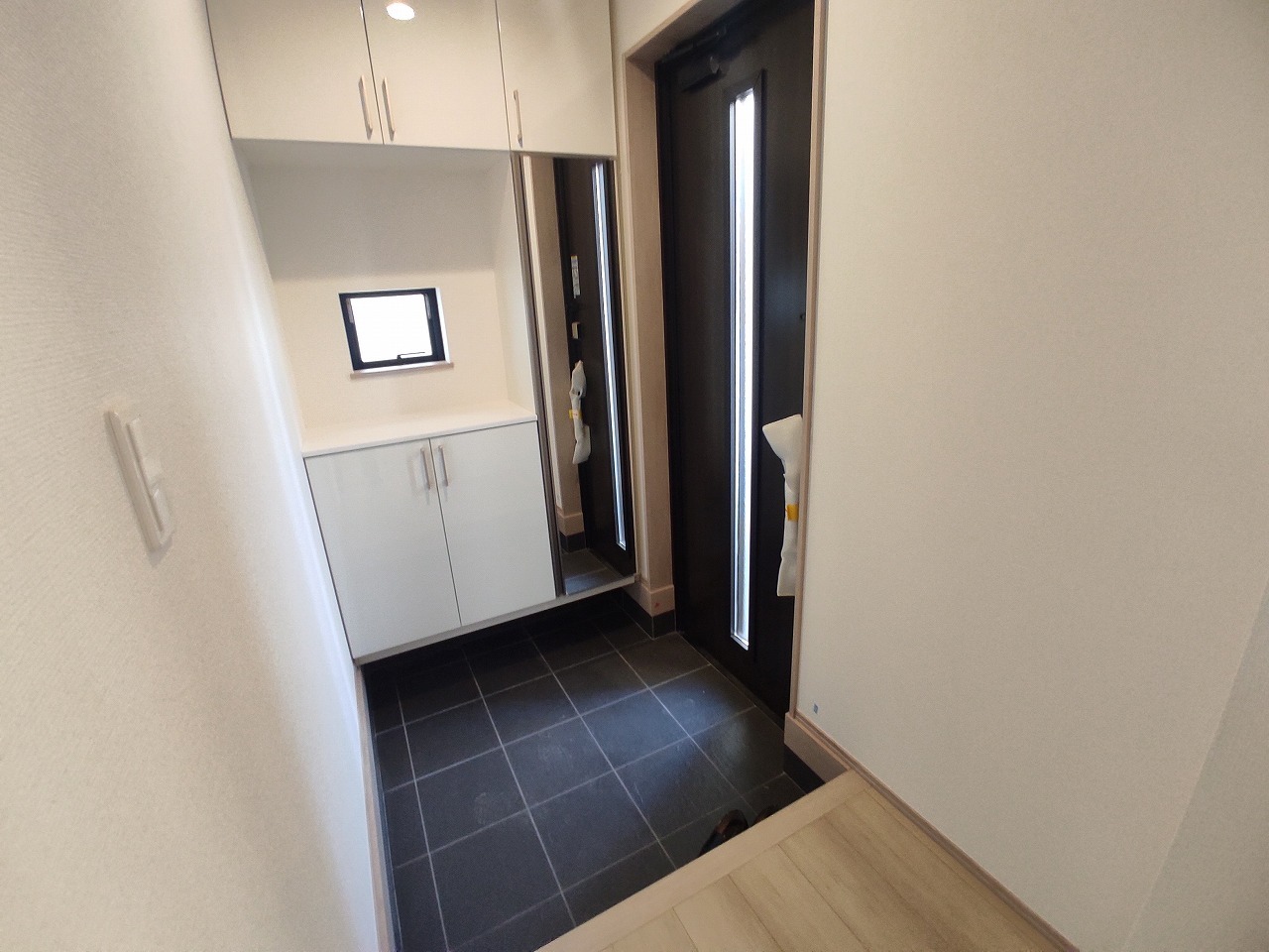 ポーチのついた新築分譲物件。玄関の印象はいかがでしょうか?入口からご覧ください。
