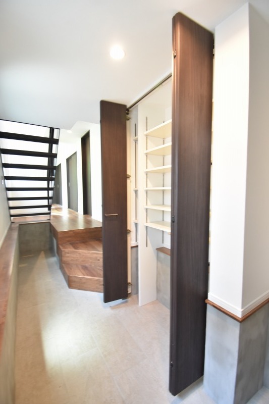 玄関を開けるとそこには土間スペースが。収納部分と自転車を停められそうなスペースも確保されています。