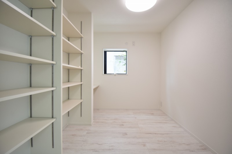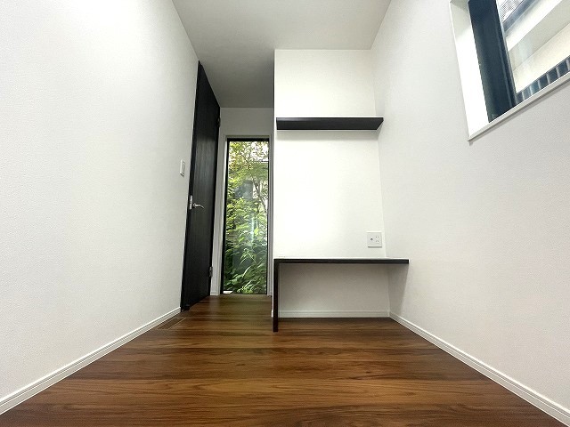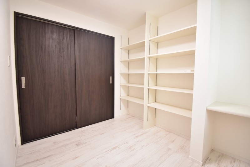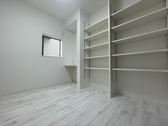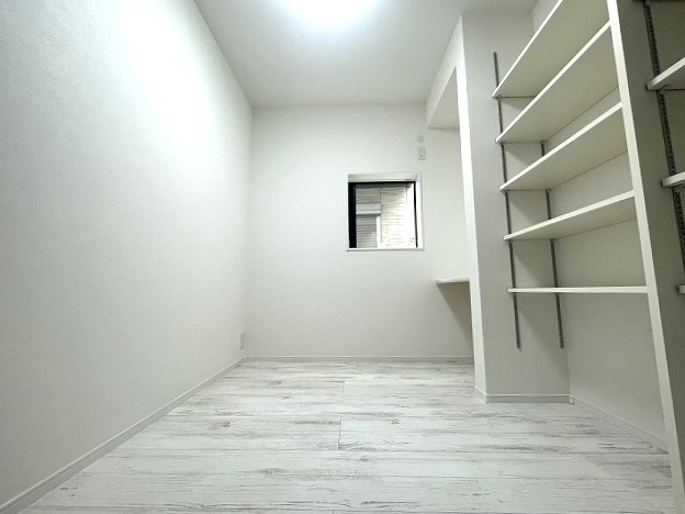 造り付け棚がある洋室。モダンなデザインと機能性を備え、快適な生活空間に。明るい窓から差し込む自然光が広々とした空間をさらに明るく開放的に感じさせます。