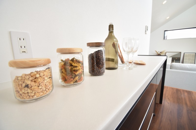 キッチンは、カウンターや壁付けタイプ。リビング部分の広がりを持たせつつ、閉鎖的にならずに明るいキッチンスペースを確保できます。
