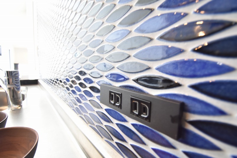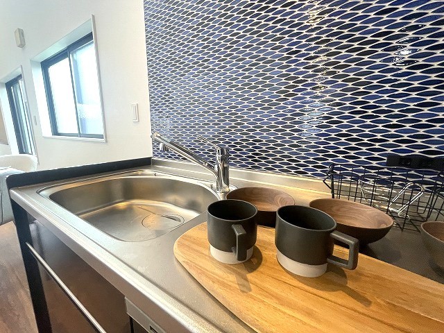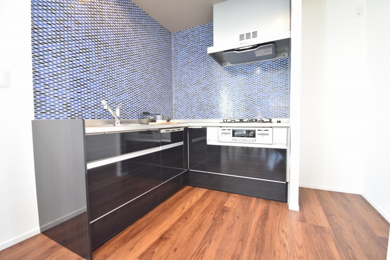 デザインされたブルータイルが印象的なキッチン。空間を有効的に利用できるL字型を採用しています。
