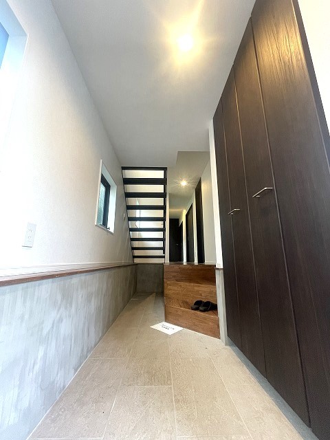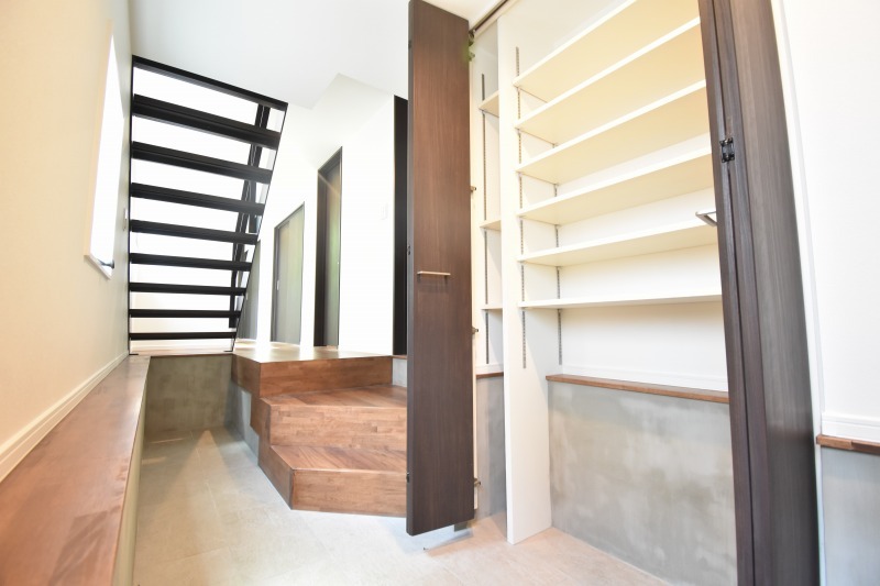 玄関は家の第一印象を左右する重要な場所。ほどよい広さとスタイリッシュな色遣いが印象的です。