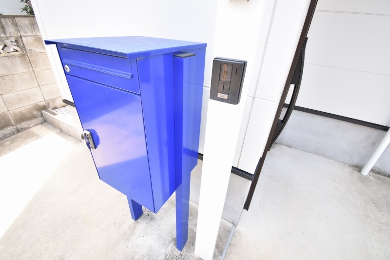 ブルーのポストが玄関に彩をプラスしています。宅配ボックスも兼ねています。