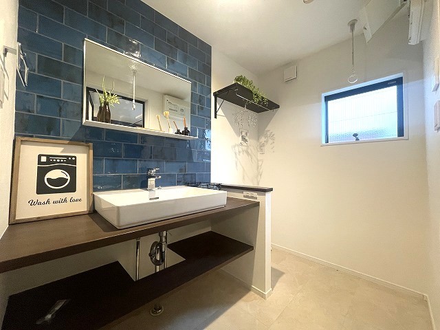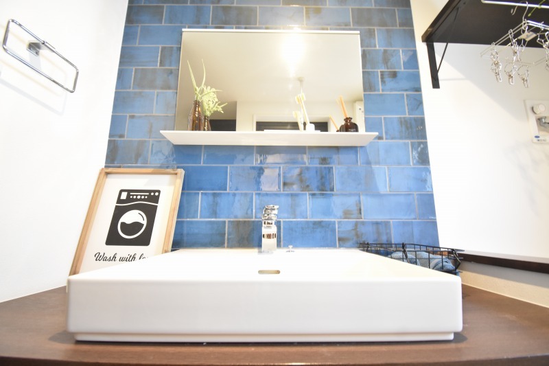 ヴィンテージ感があるオールドブルーが印象的な洗面。