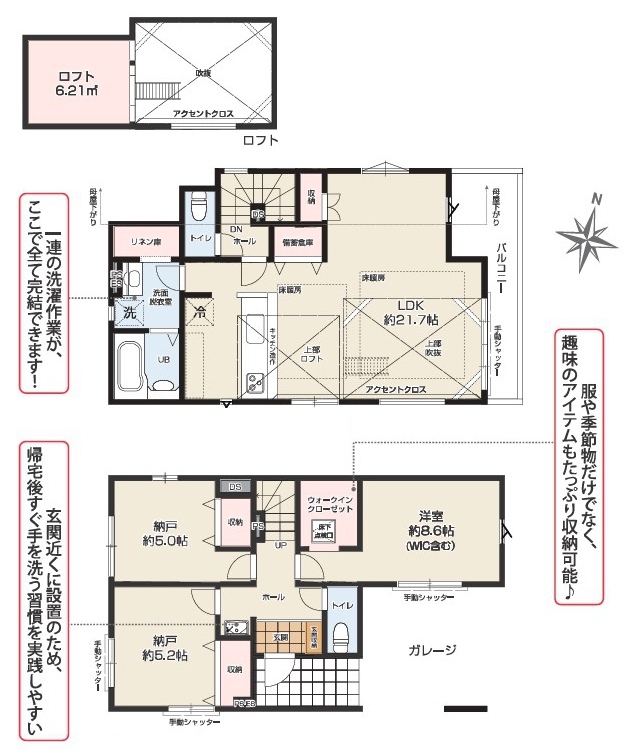 吹抜けの空間を意識した開放感のある間取り。そして上部にロフトを配置。スタイリッシュかつ収納も豊富で長く機能的に住める家を目指して。