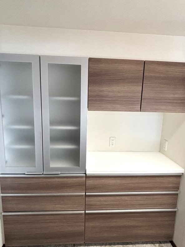 カップボードをキッチンの背面に設置、視界を遮らずに収納力を確保しました。