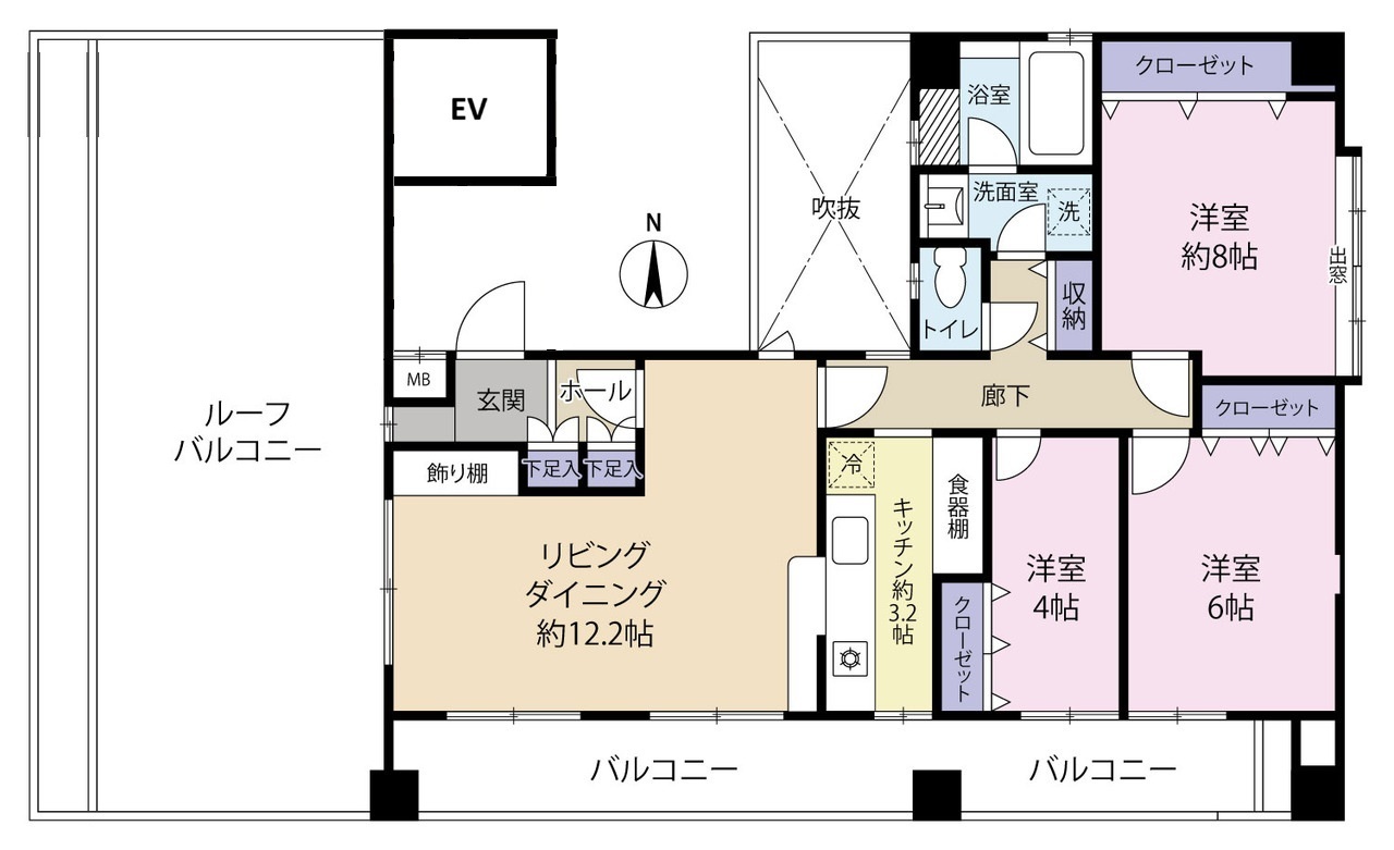 | 間取 | 3LDK (LDK15.4帖、洋室4帖、洋室8帖、洋室6帖) | ||