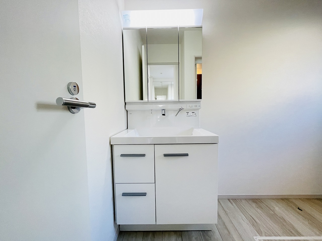 三面鏡に洗面台。 コンセントに照明機能、多機能性を備えた設備です。