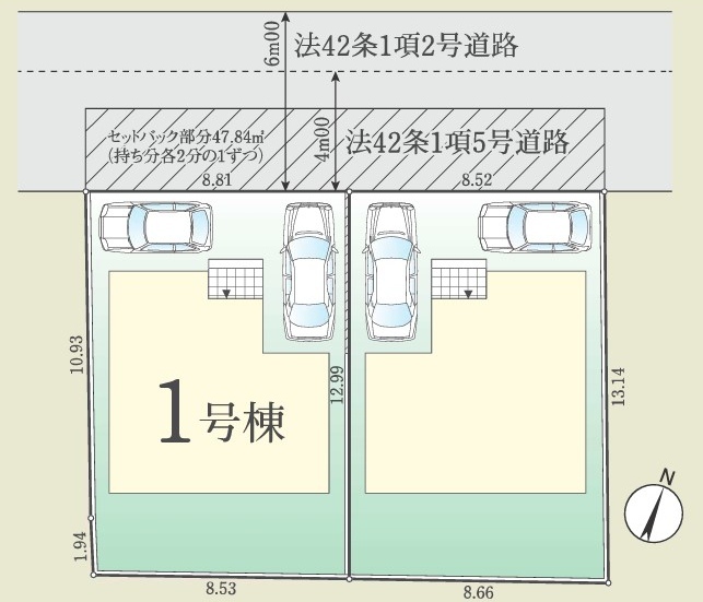 | 土地面積 | 112.29m² 実測 (私道47.84m²別に有、私道持分比率:1/2、セットバック47.84m²) | ||