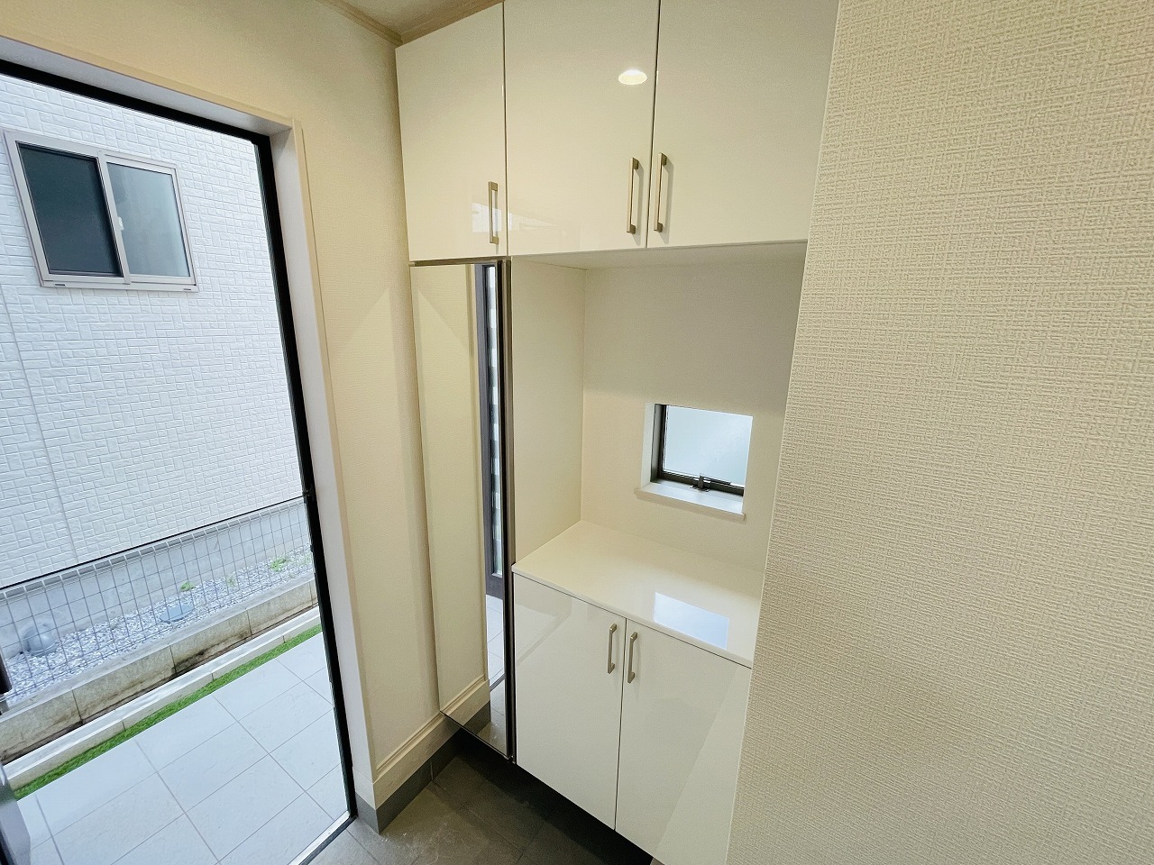 コンパクトながらも、使い勝手の良い玄関スペース。明るいデザインと、収納スペースを効果的に配置することで、使い勝手を最大限に引き出しています。