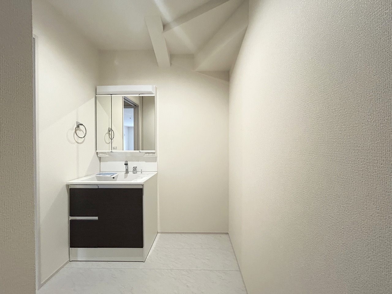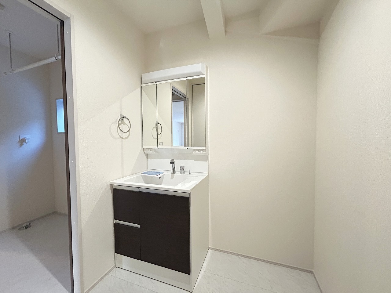 三面鏡を採用した洗面化粧台。鏡の裏にも収納スペースがあります。