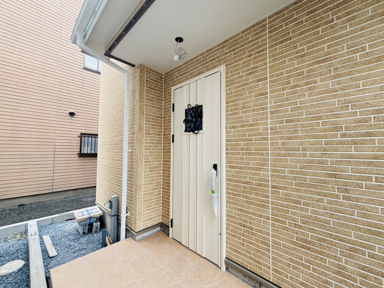 ポーチのついた新築分譲物件。玄関の印象はいかがでしょうか?入口からご覧ください。