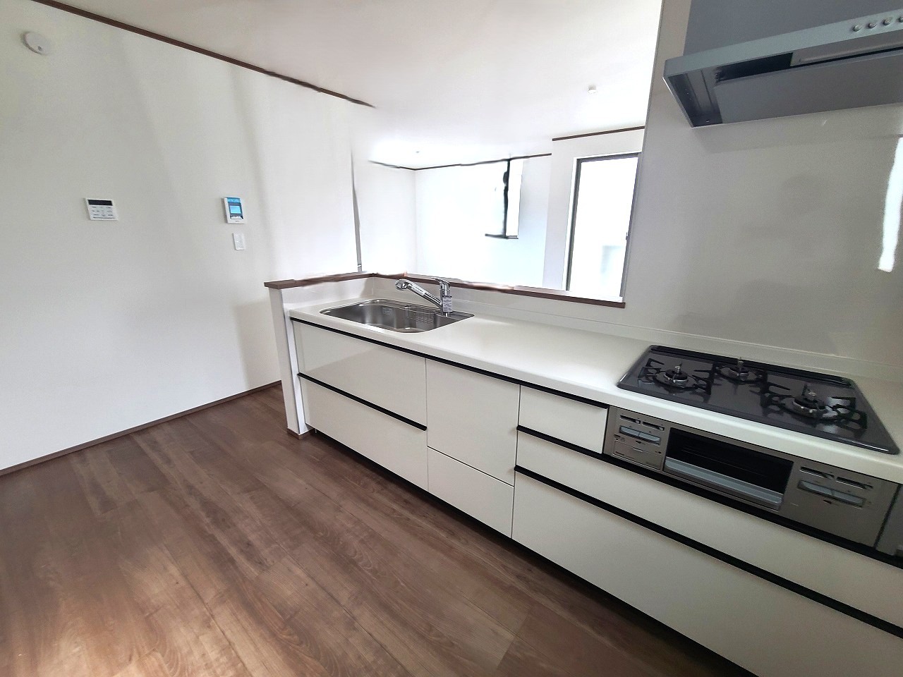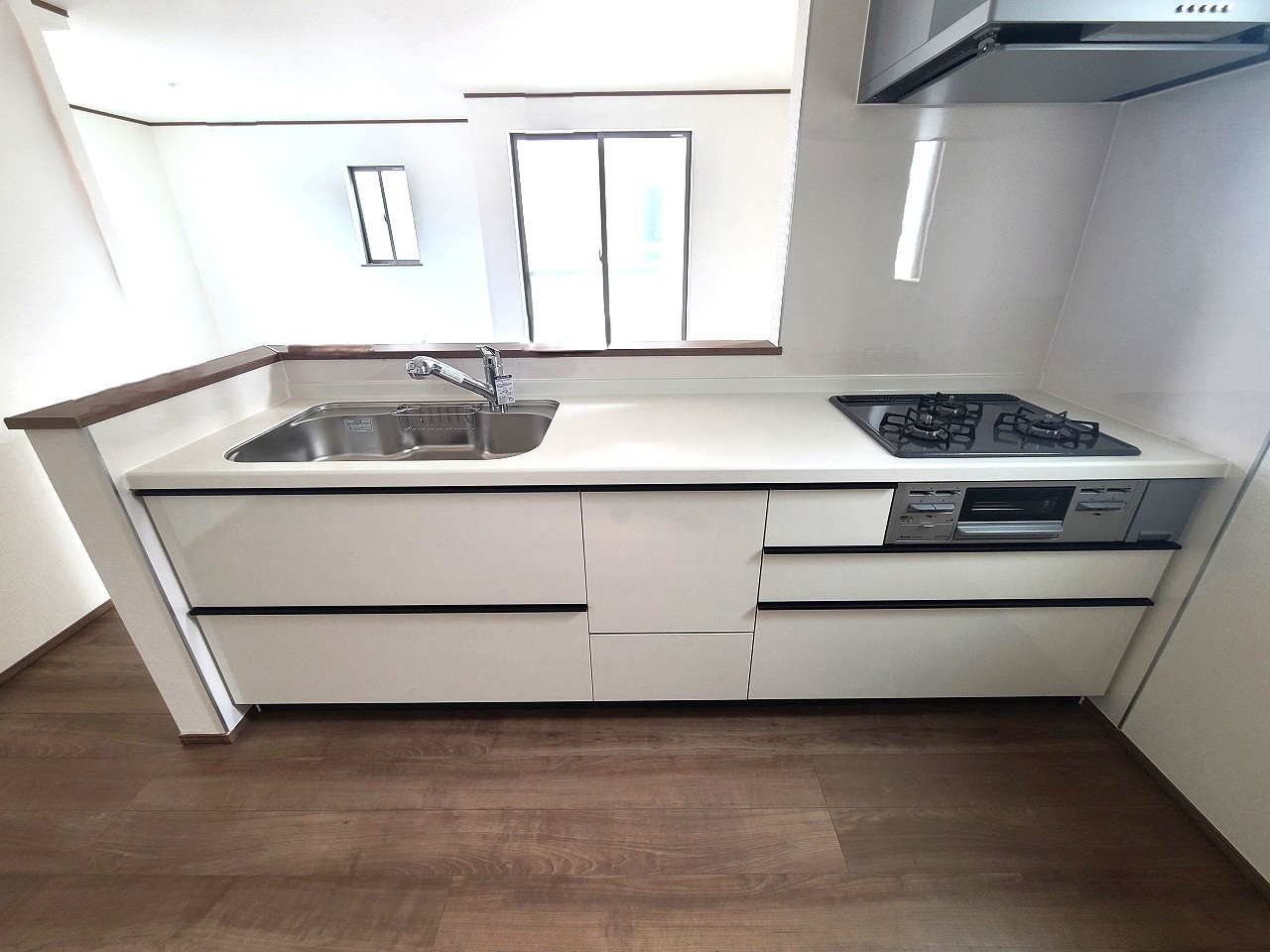 A号棟 リビングにいる家族の顔が見渡せるカウンターキッチン。お料理もより一層おいしく、楽しく。食器棚を背面に設置しても十分な広さを確保しています。