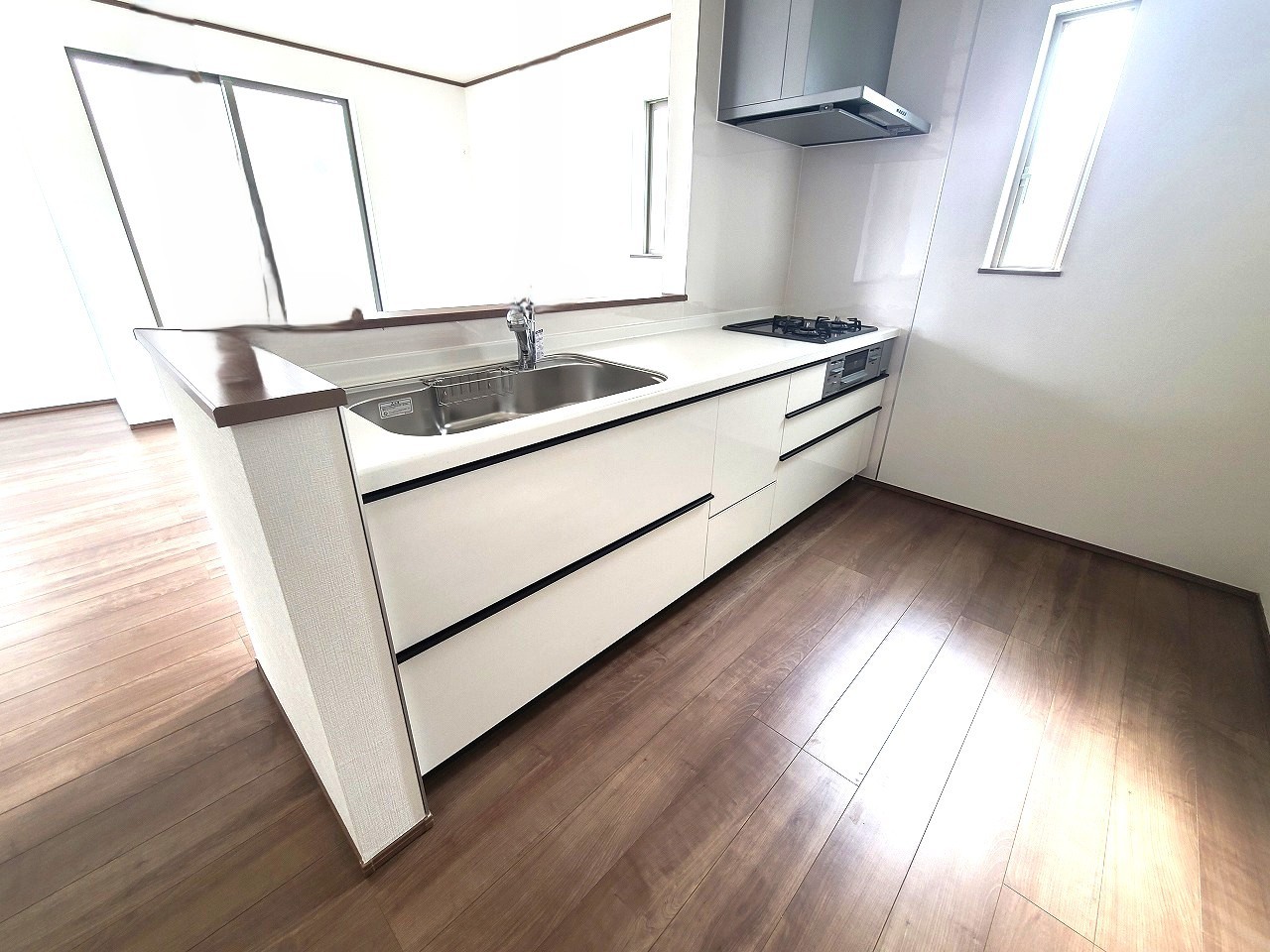B号棟 リビングにいる家族の顔が見渡せるカウンターキッチン。お料理もより一層おいしく、楽しく。食器棚を背面に設置しても十分な広さを確保しています。