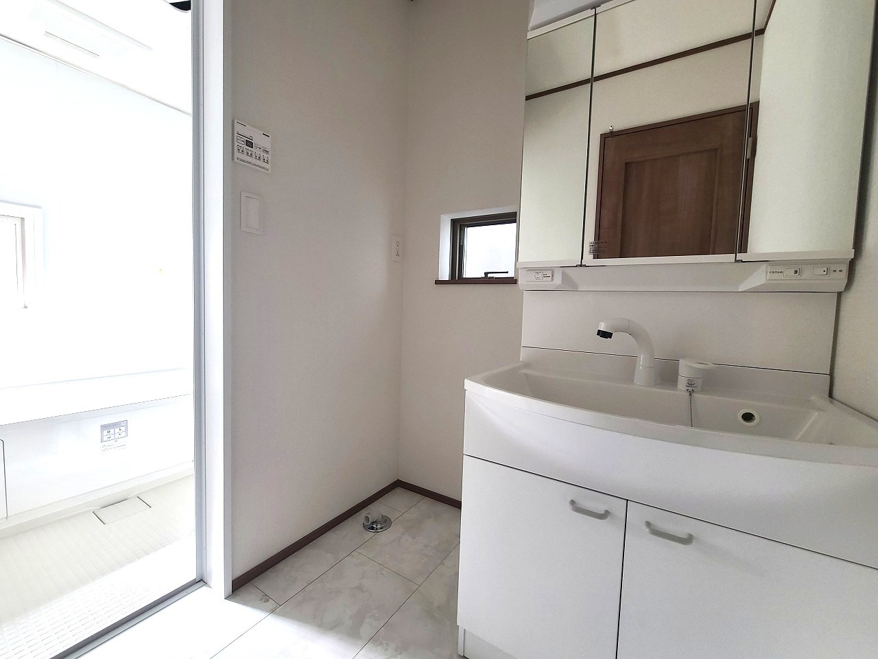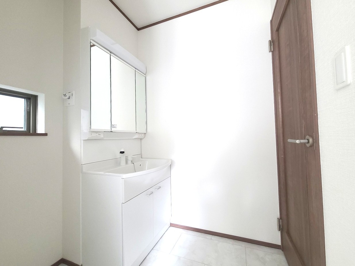 B号棟 使い勝手の良い洗面台、窓があることで換気もしやすく清潔感のある空間を保てます。