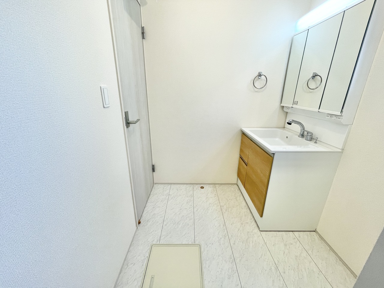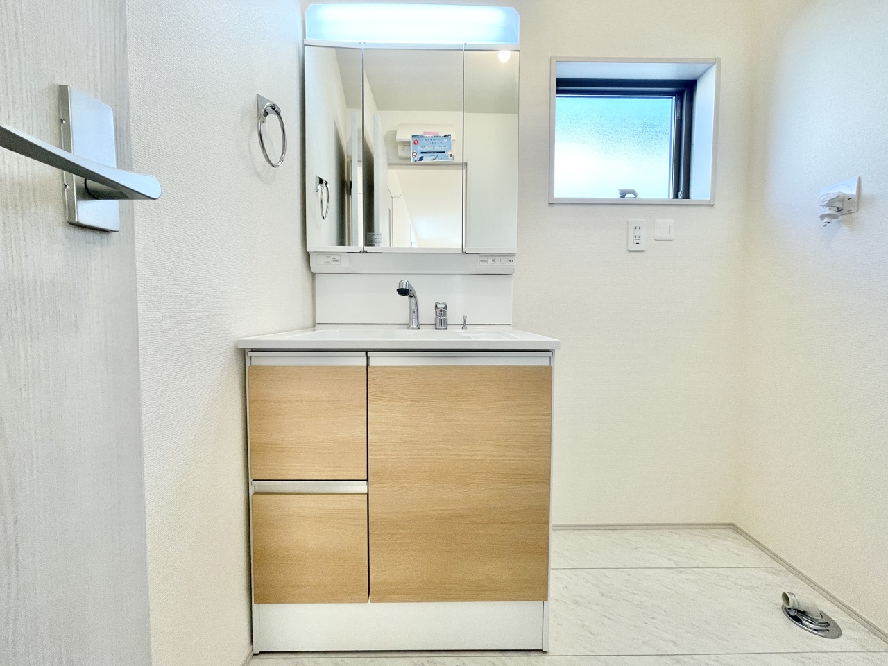 清潔感のある空間に、木目の温かさが調和する洗面スペース。