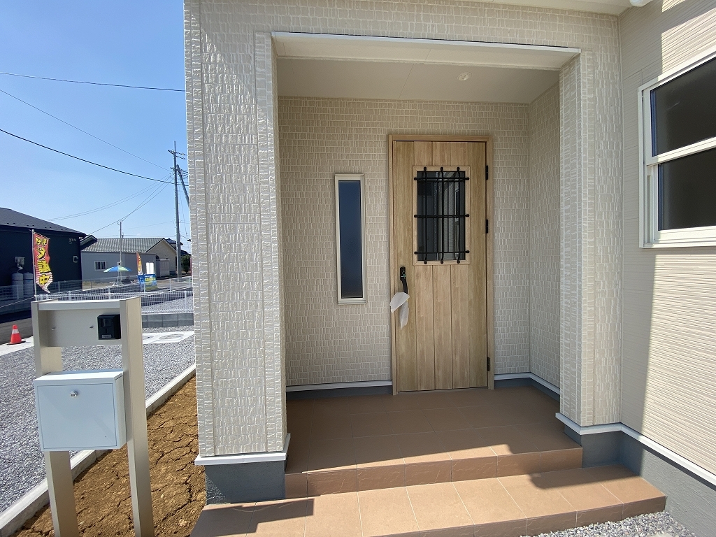 ポーチのついた新築分譲物件。玄関の印象はいかがでしょうか?入口からご覧ください。