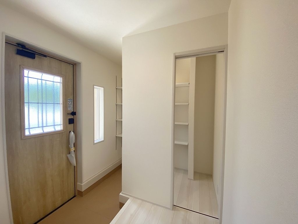 玄関横にシューズインクローク付き、雨具や三輪車を置いても余裕の広さ。