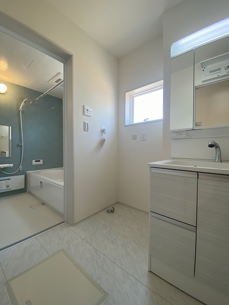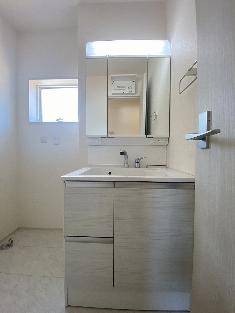 収納豊富な三面鏡付洗面化粧台。水回りのあれこれがキレイに収まりそうですね。