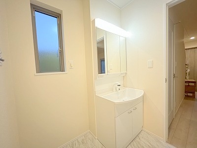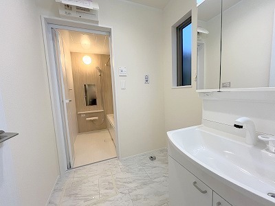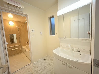 化粧台はやっぱり色が一番。シャワーヘッド付きの収納充実タイプです。